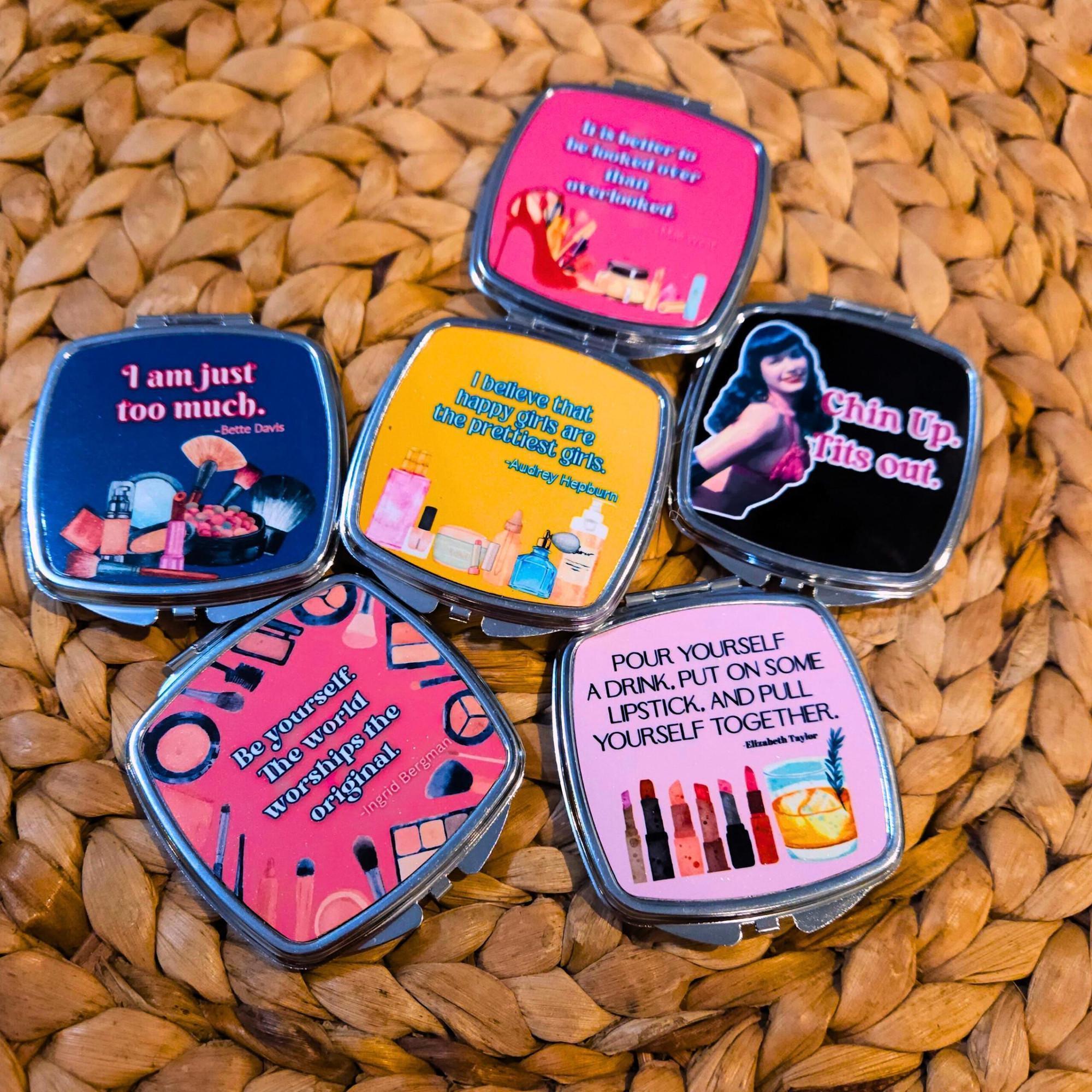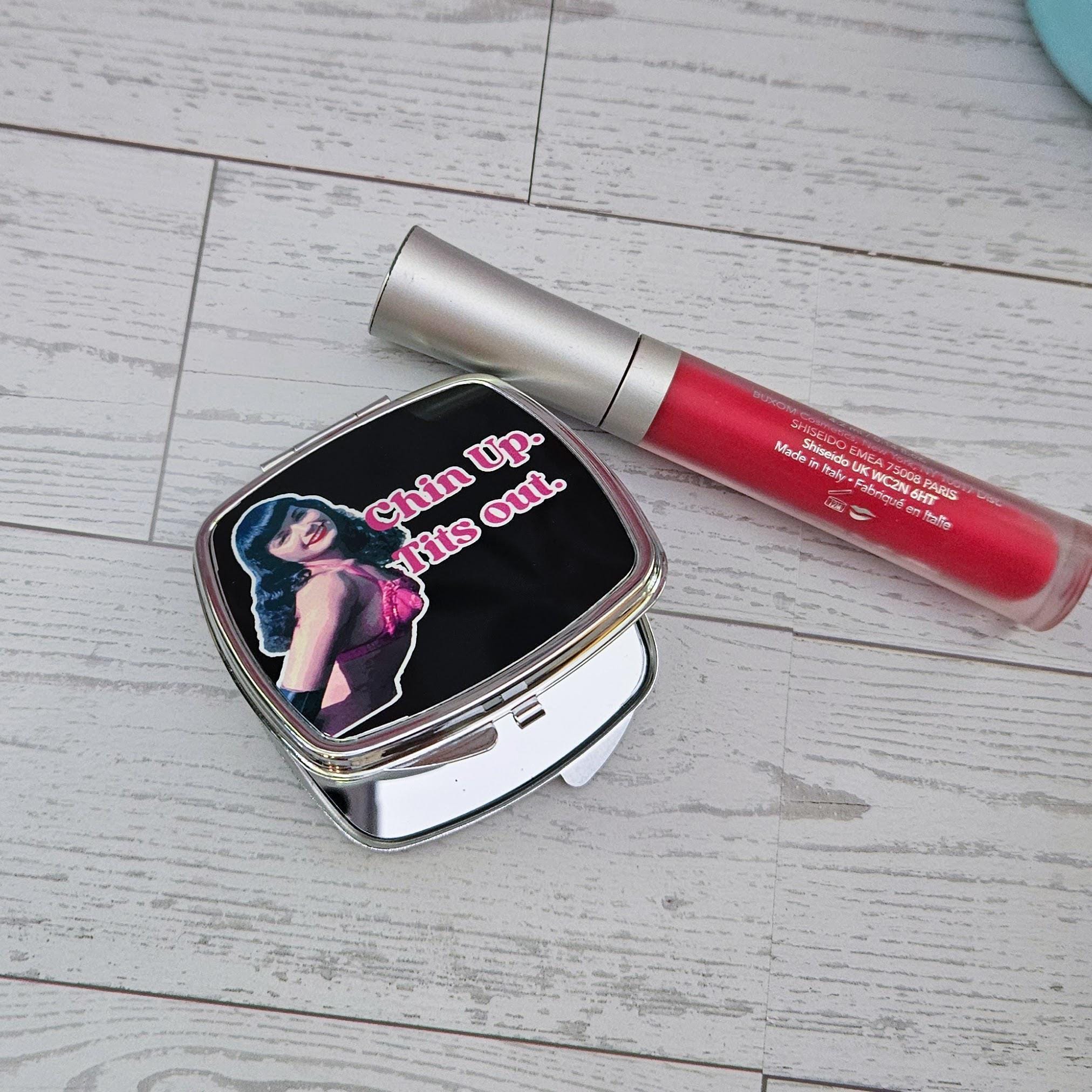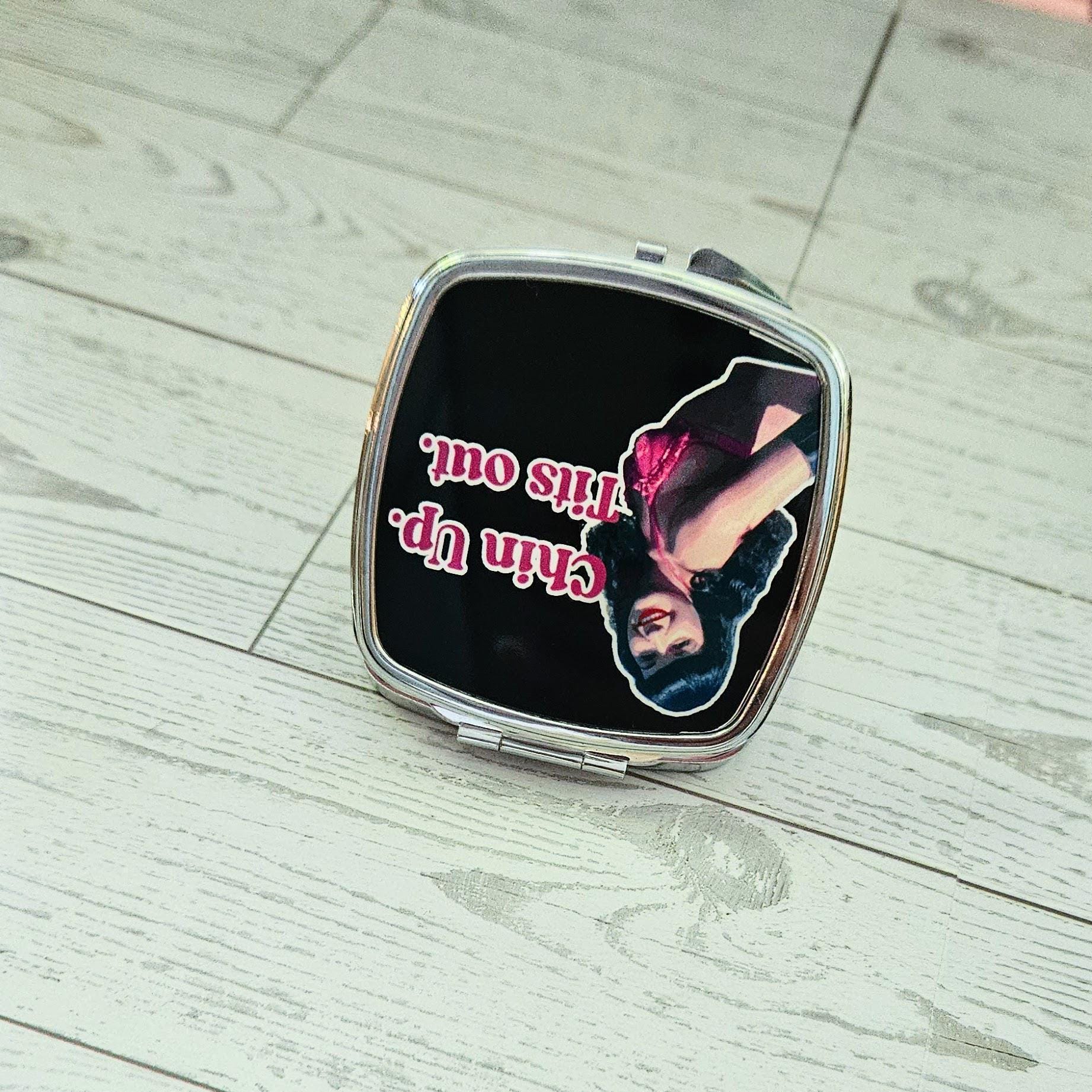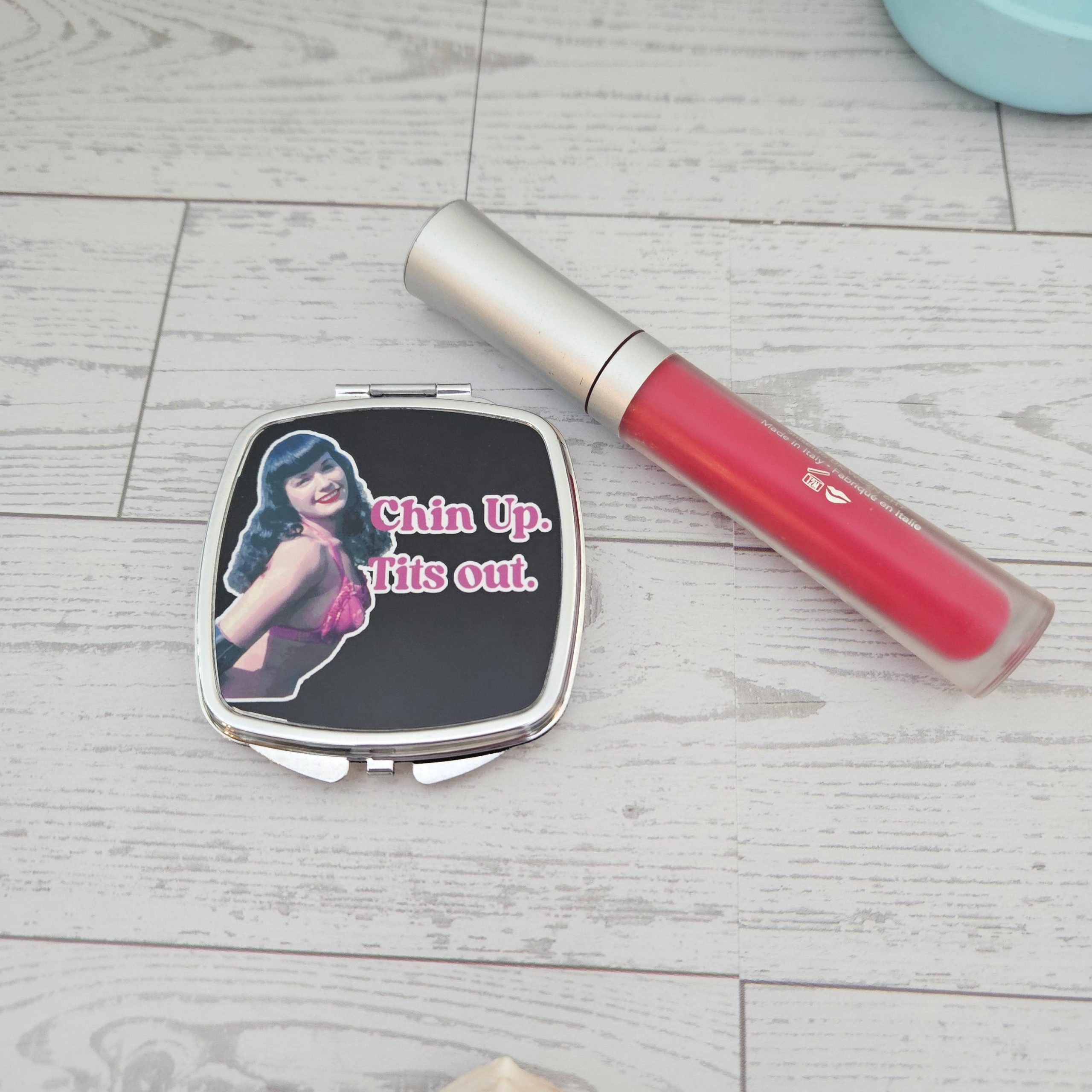 Carry Confidence in Your Pocket. Channel the timeless allure of Bettie Page with this retro-inspired compact mirror. Featuring the iconic pin-up queen and the empowering phrase "Chin Up, Tits Out," this accessory is more than just a mirror—it's a statement piece for the bold and fabulous.
