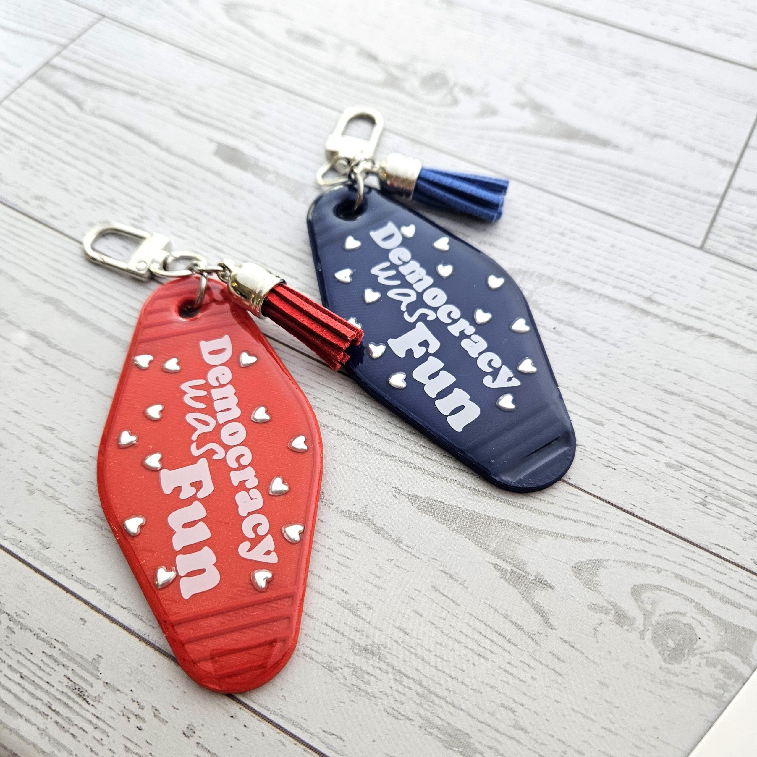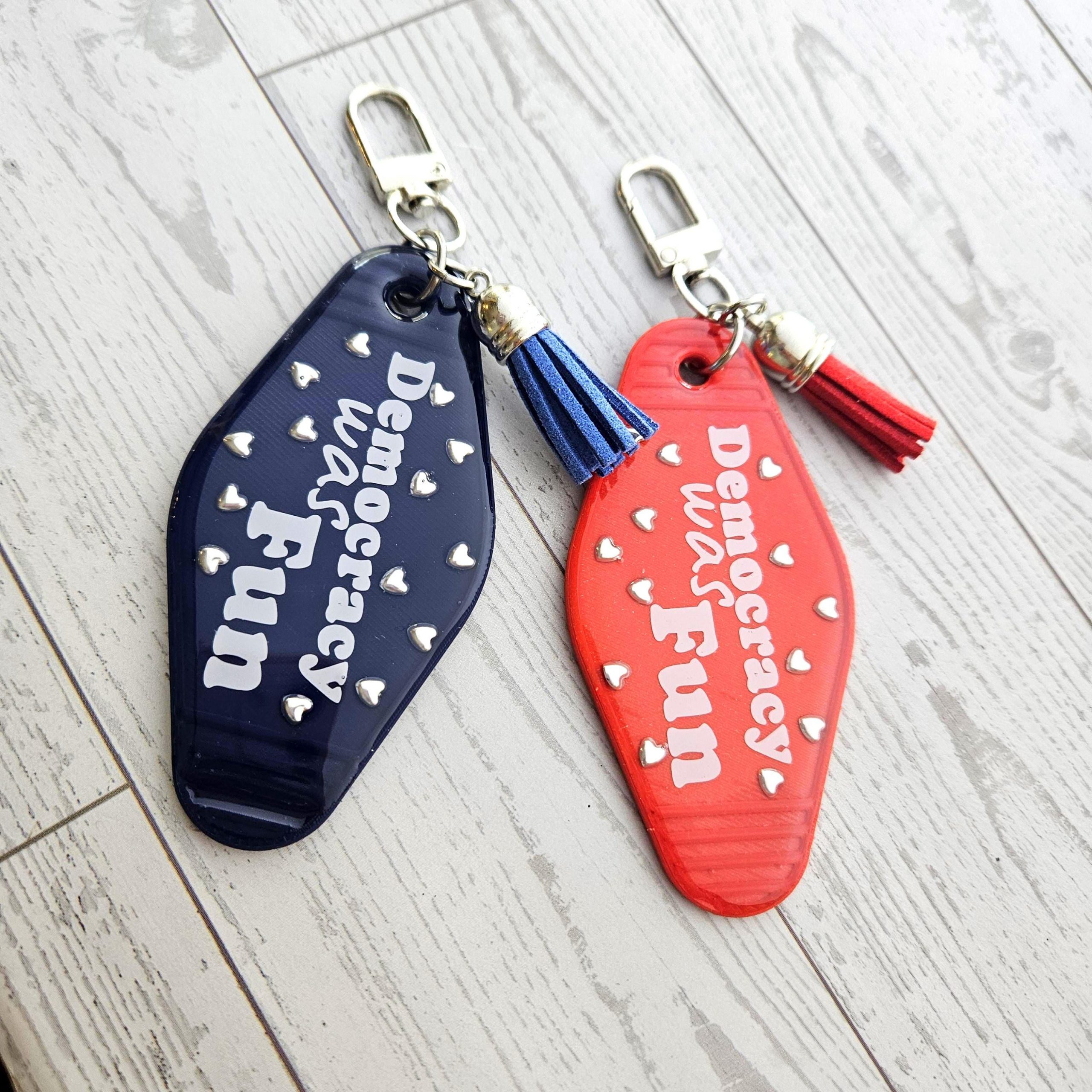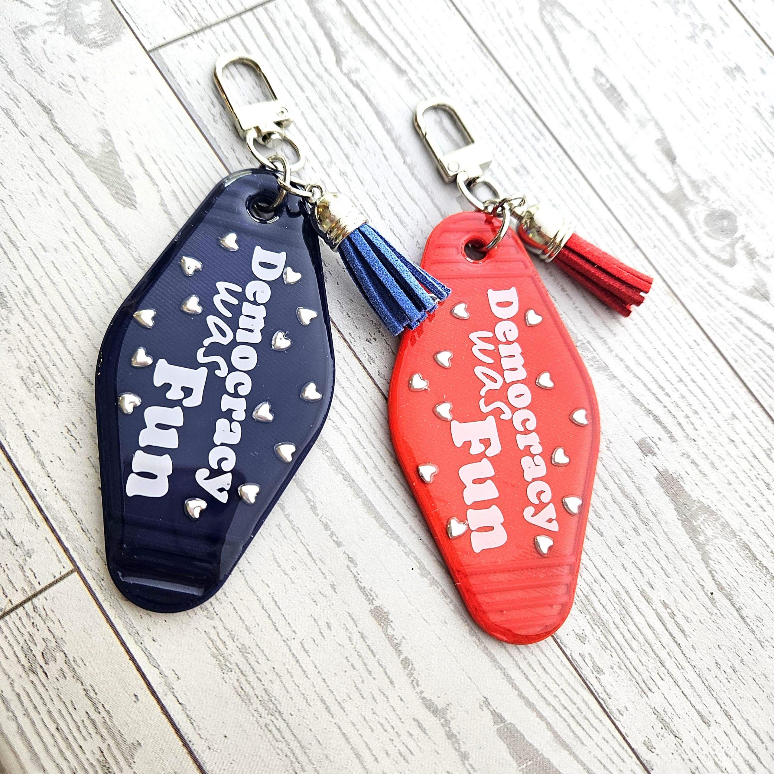 Handmade resin motel keychain for everyone who remembers when democracy was a thing — bold political statement, perfect activist gift.