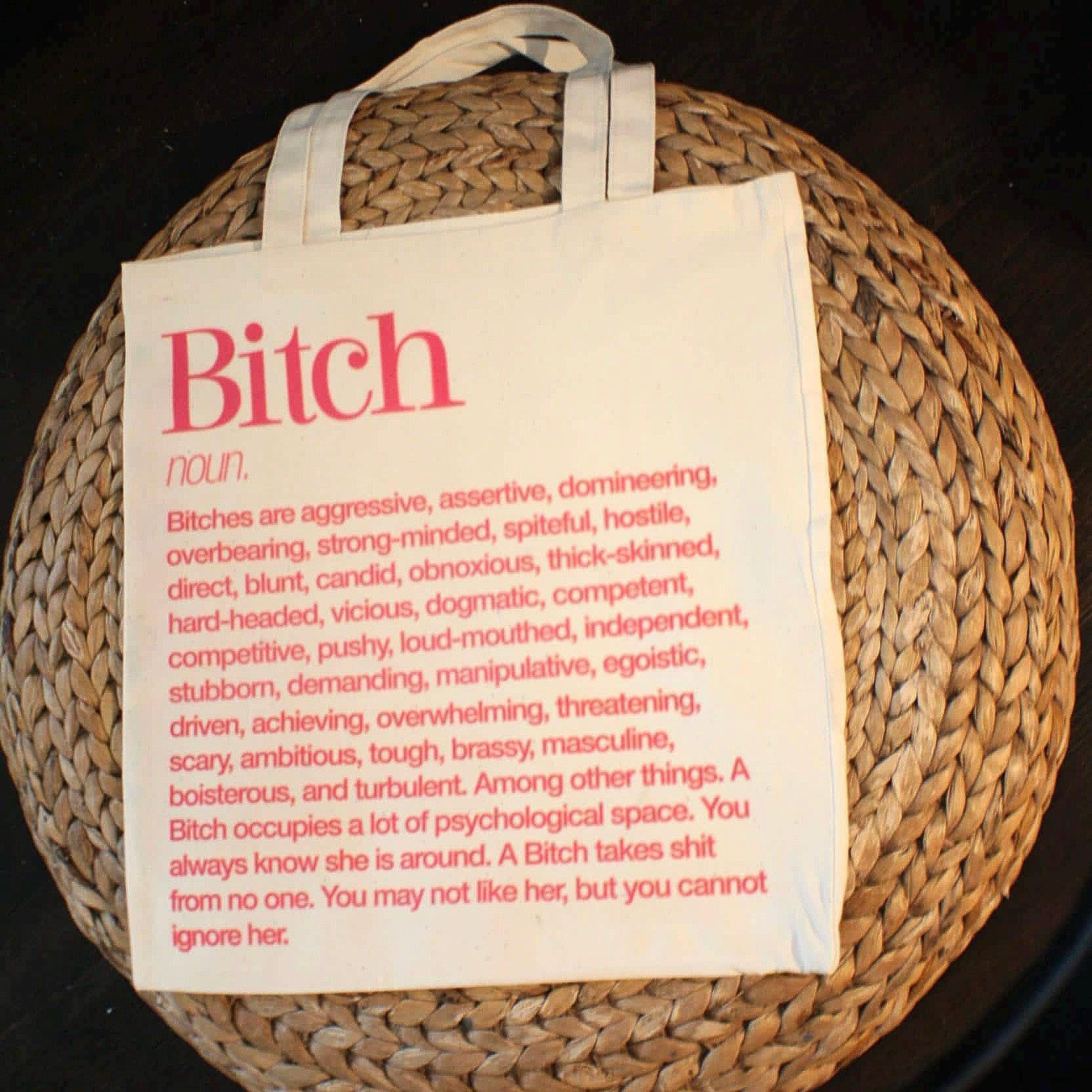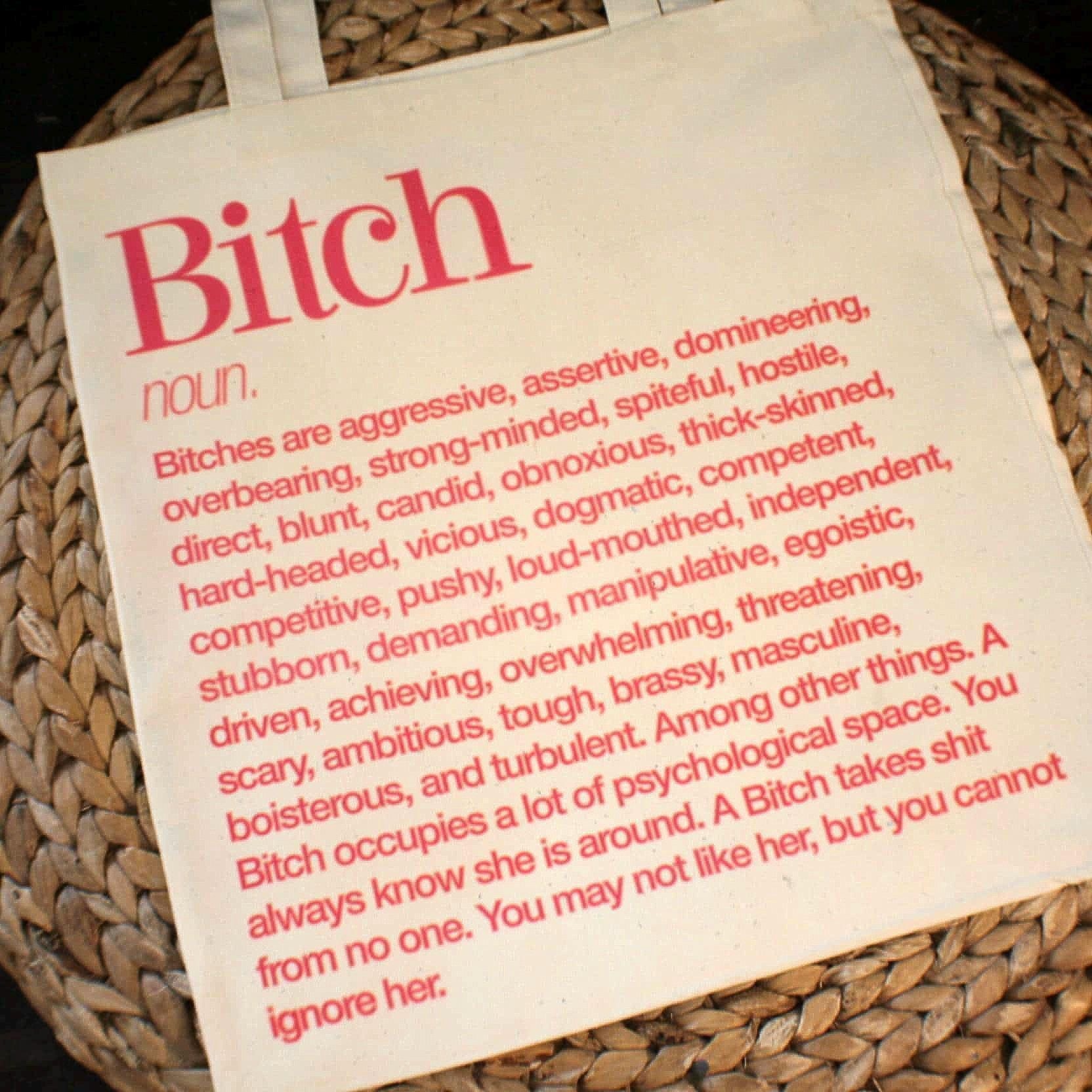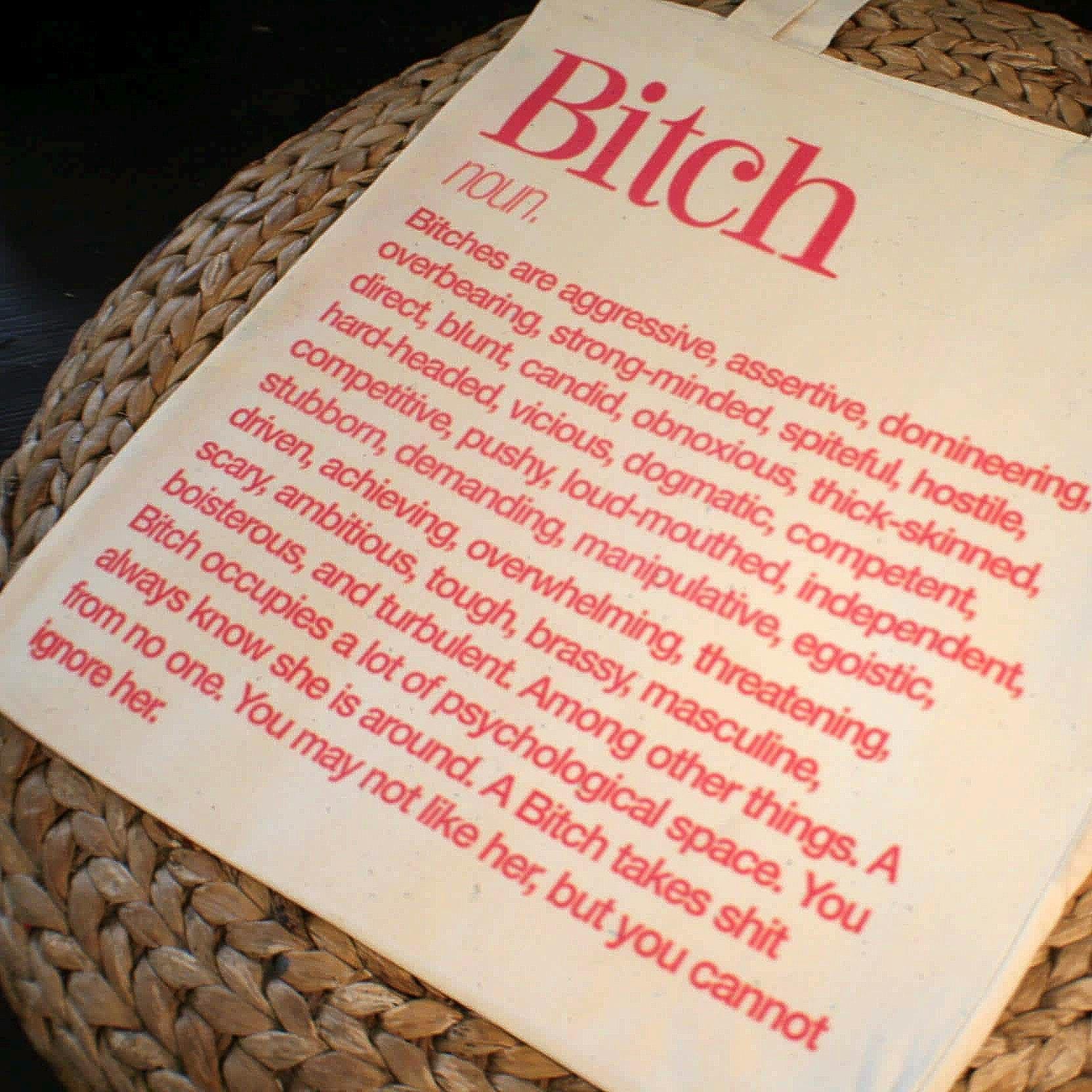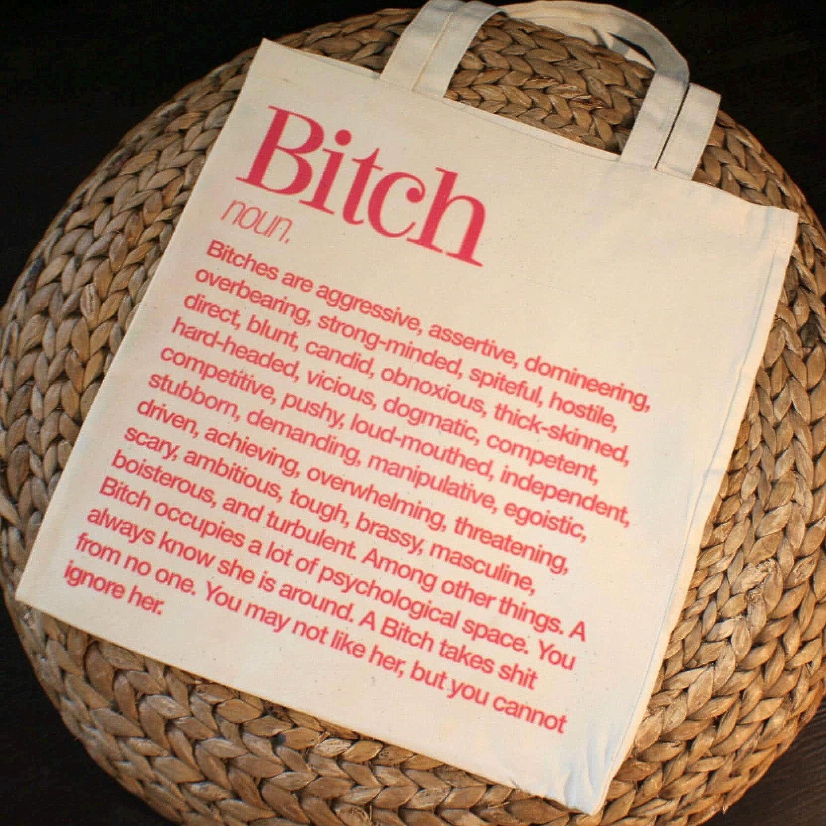 Celebrate boldness, strength, and independence with the Bitch Manifesto Definition Tote Bag, inspired by the revolutionary writing of Joreen. This empowering tote features the iconic definition of "Bitch" printed in vibrant hot pink on high-quality natural canvas, making it both a functional accessory and a statement of unapologetic confidence.