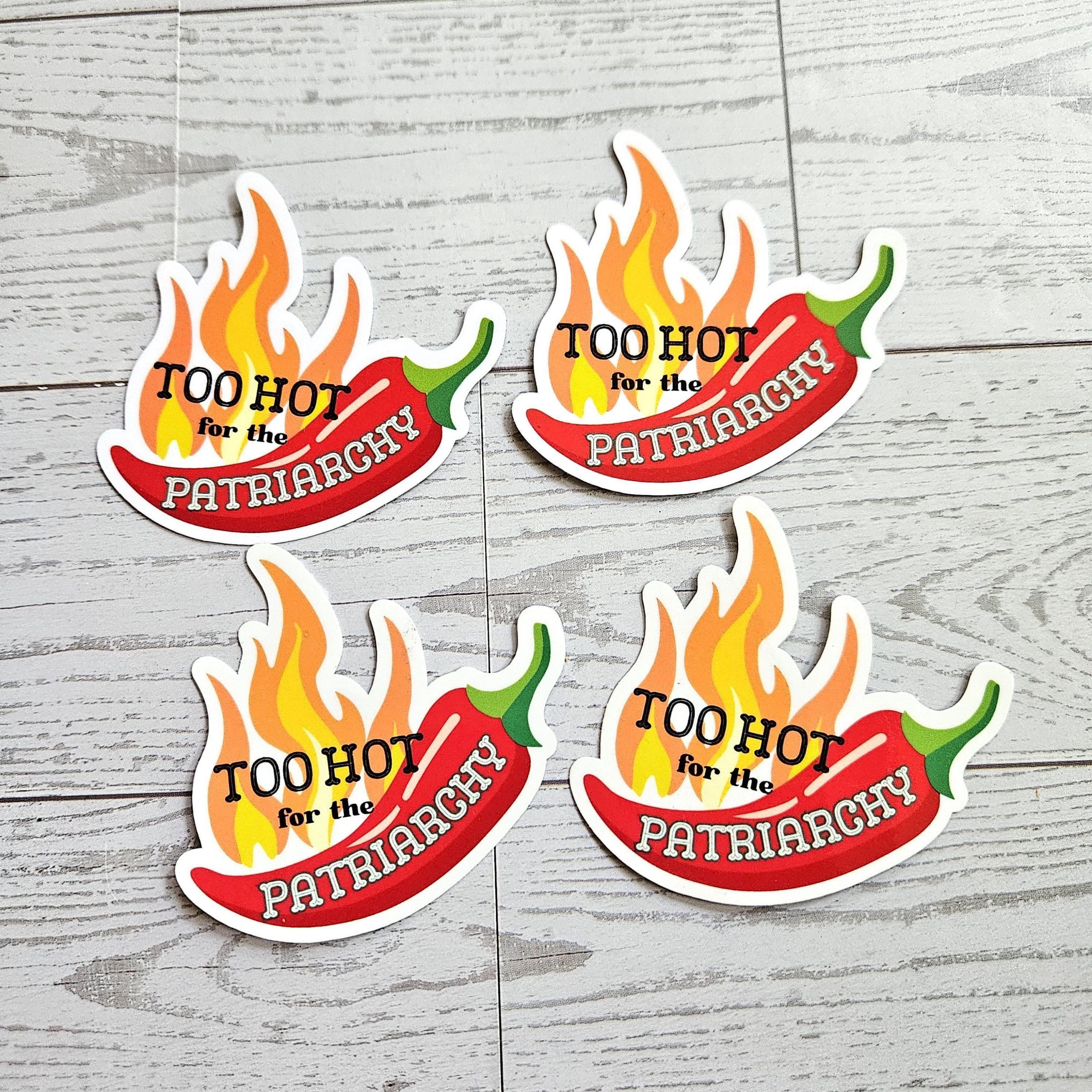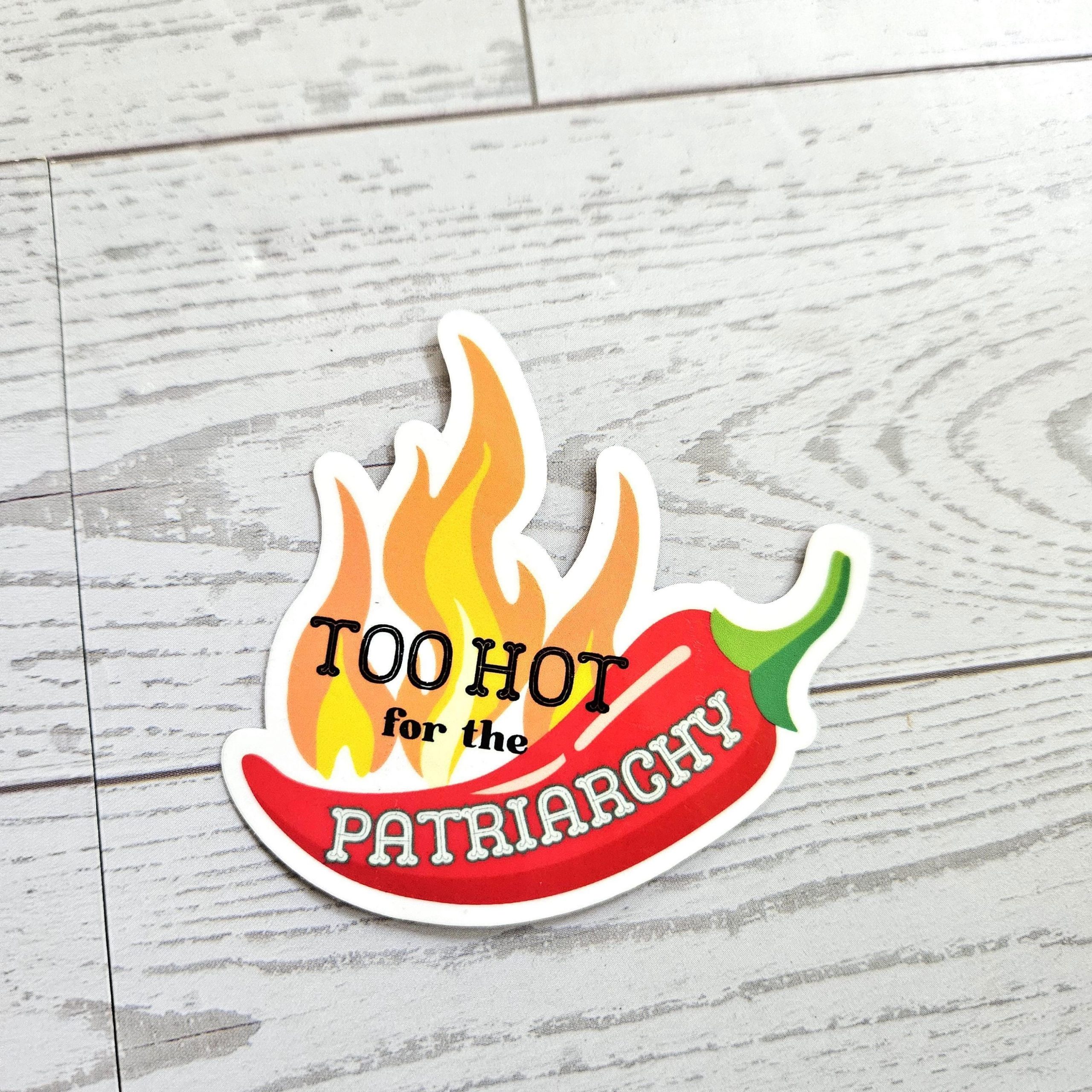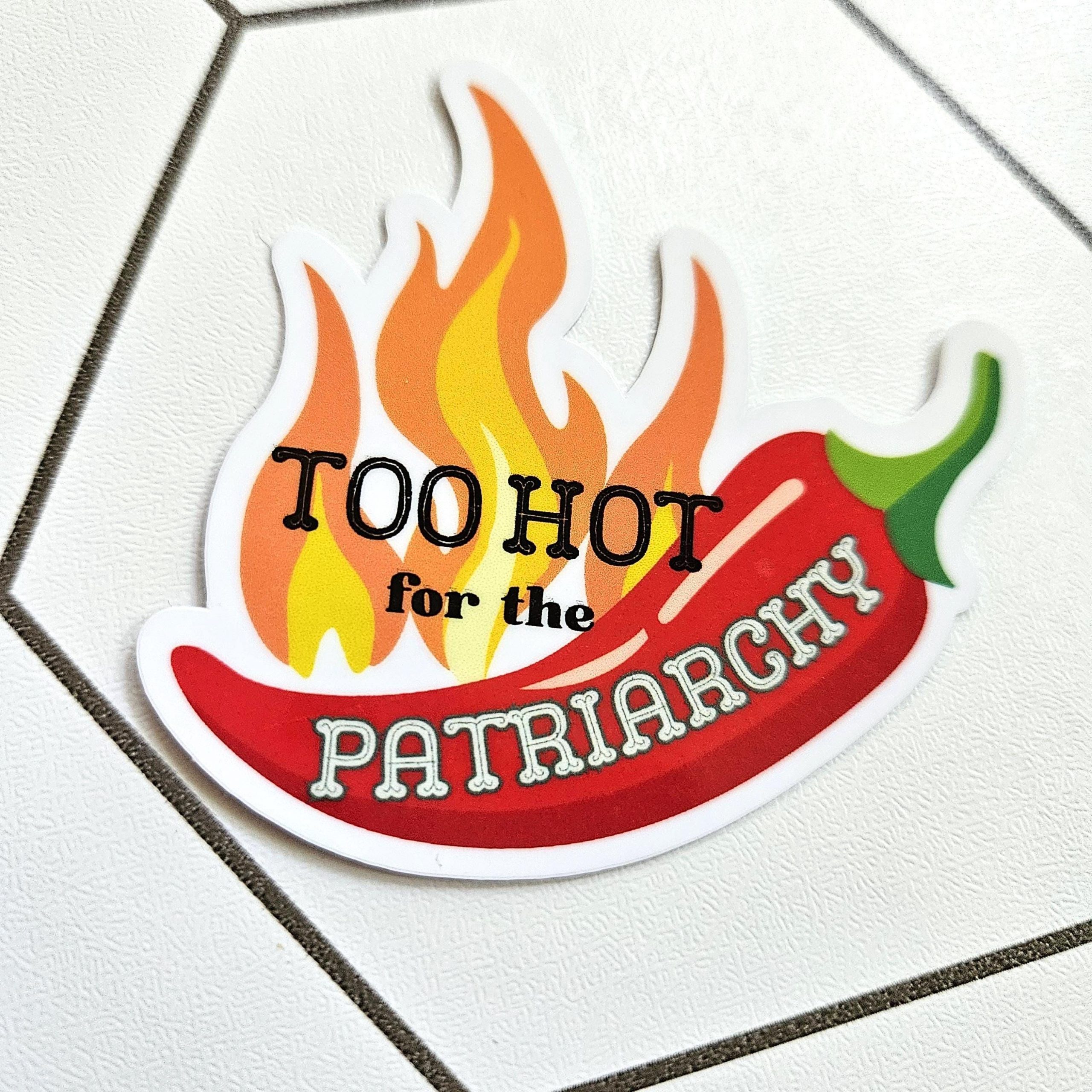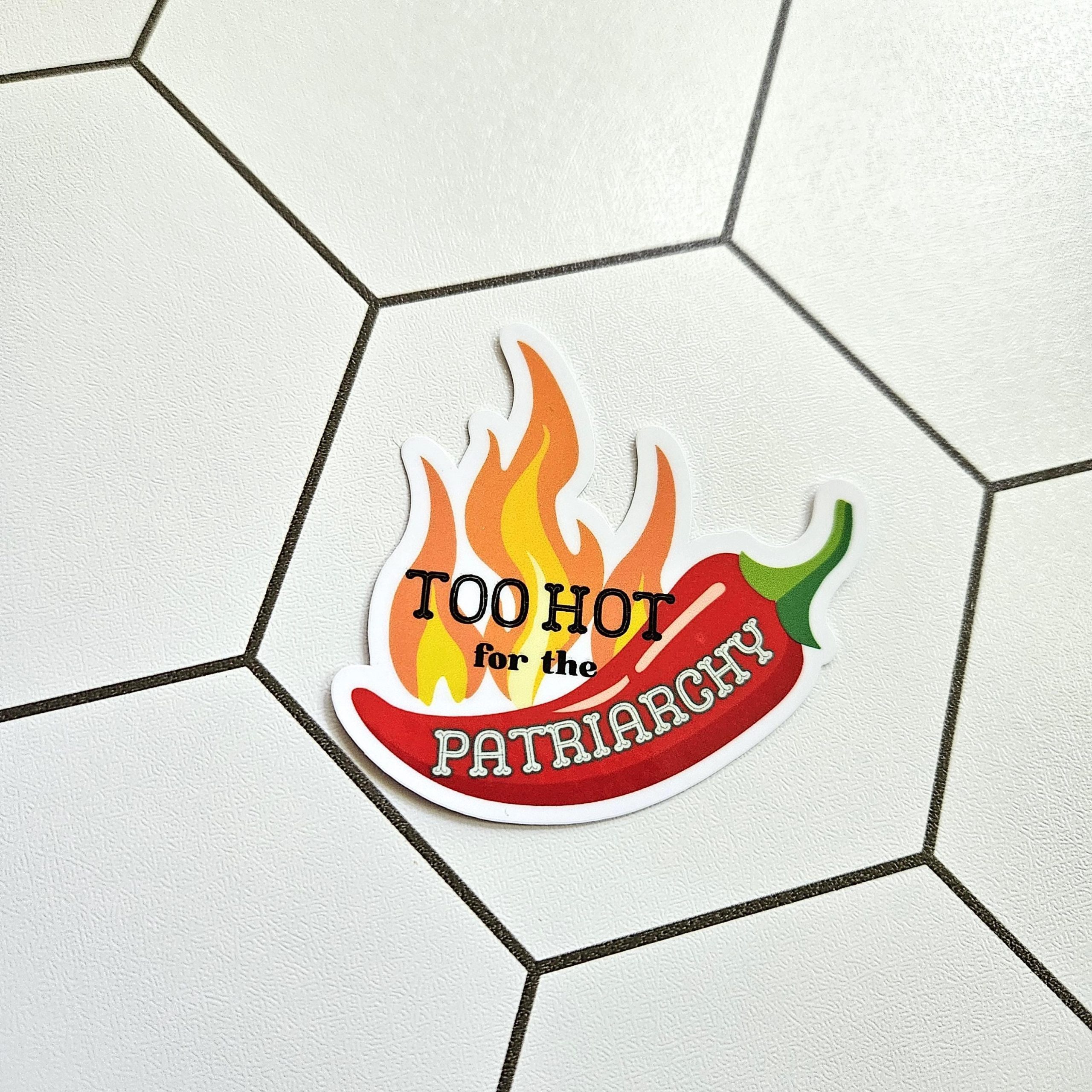 Spice things up with this bold feminist sticker that says exactly what you're thinking—Too Hot for the Patriarchy. Featuring a bright red jalapeño and flames in a vintage-inspired font, this waterproof vinyl sticker is retro, rebellious, and ready to stick it to the man. Literally.