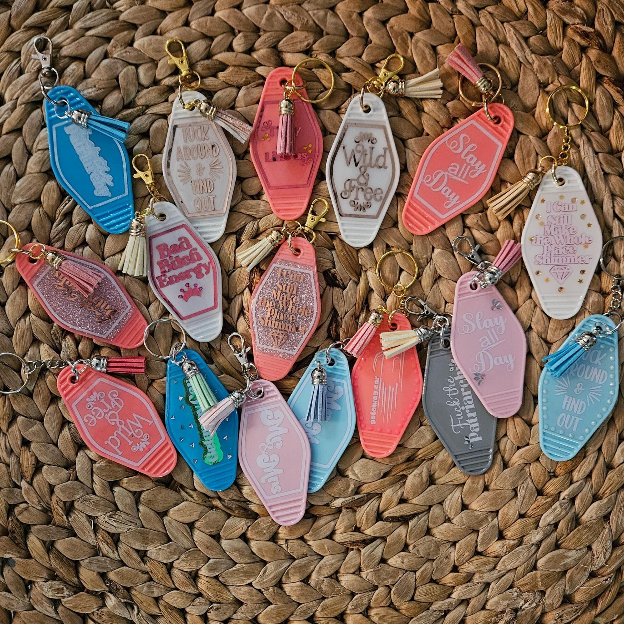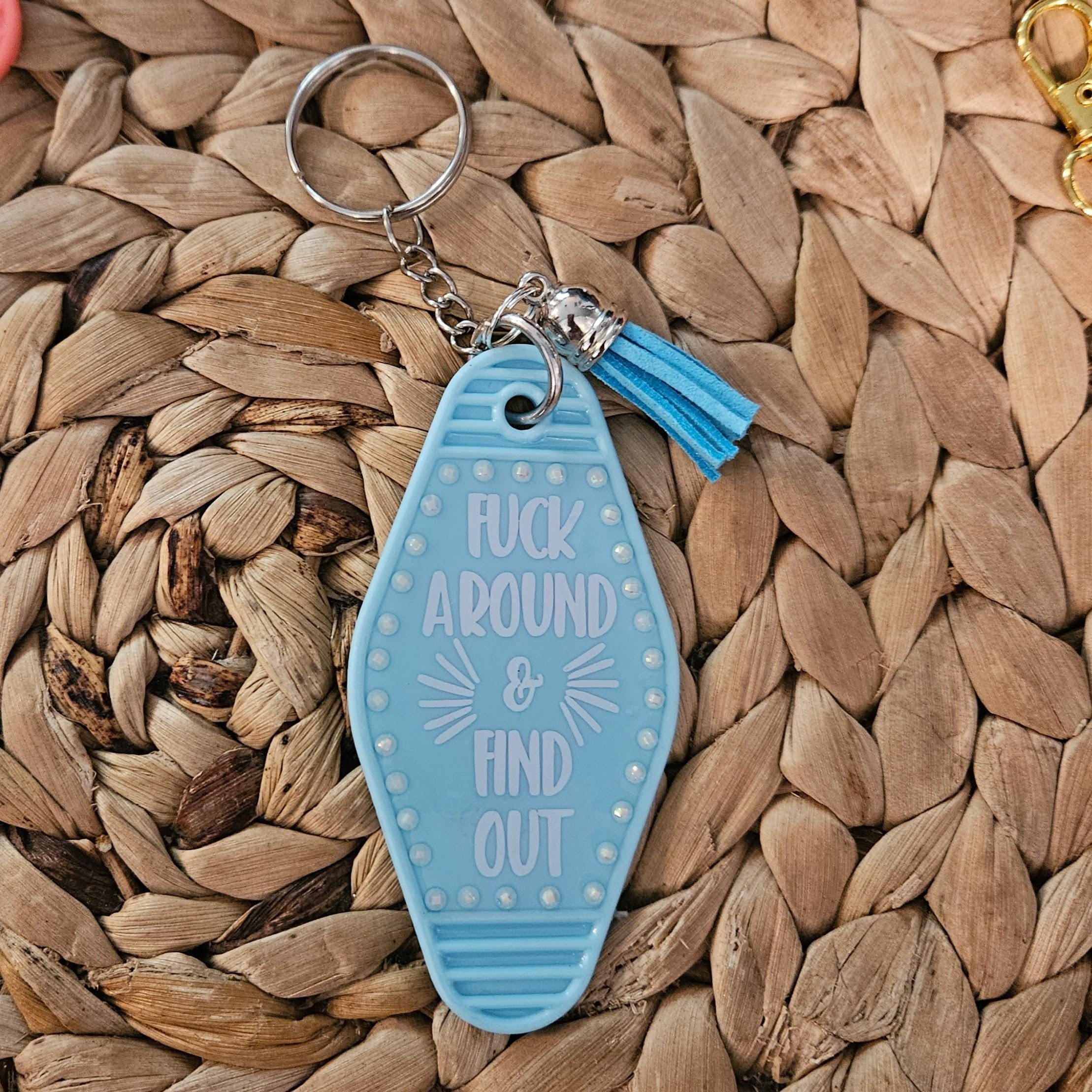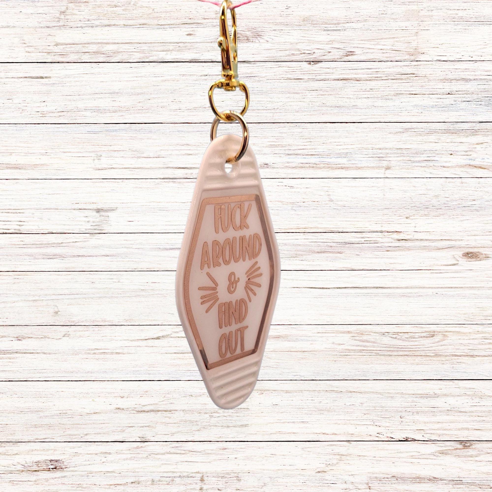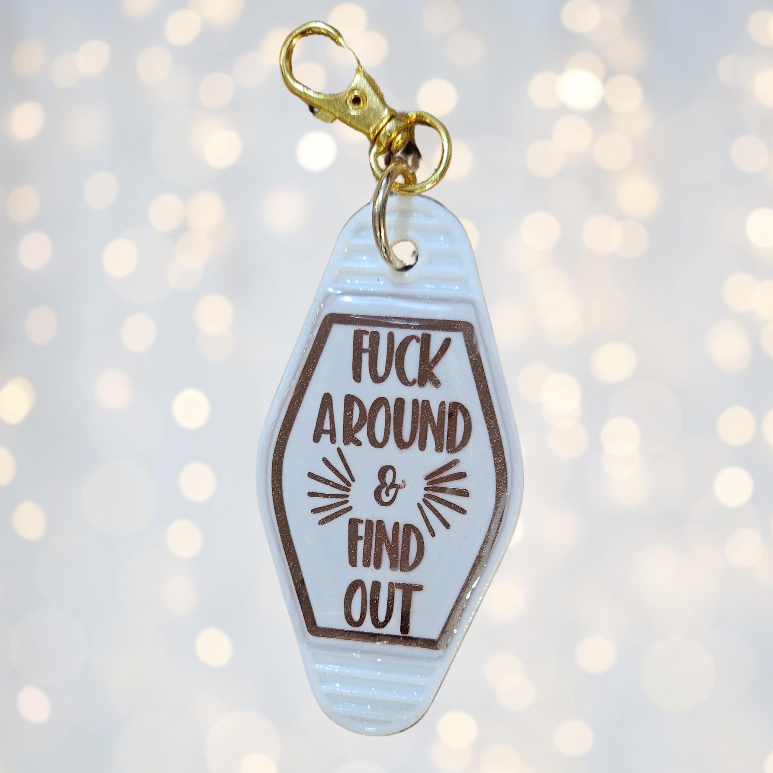 Add a touch of playful attitude to your everyday essentials with this unique Motel Keychain. Made with high-quality materials, this keychain features eye-catching gold foil text that reads Fuck Around and Find Out on a white matte PLA background. Each piece is carefully crafted using 3D printing technology and each decal is cut and hand applied. Each motel keychain is set with resin to ensure longevity and daily handling. These keychains are 100% handmade to ensure a one-of-a-kind finish. Perfect for adding a pop of personality to your keys or bag, this Motel Keychain is sure to make a statement wherever you go.