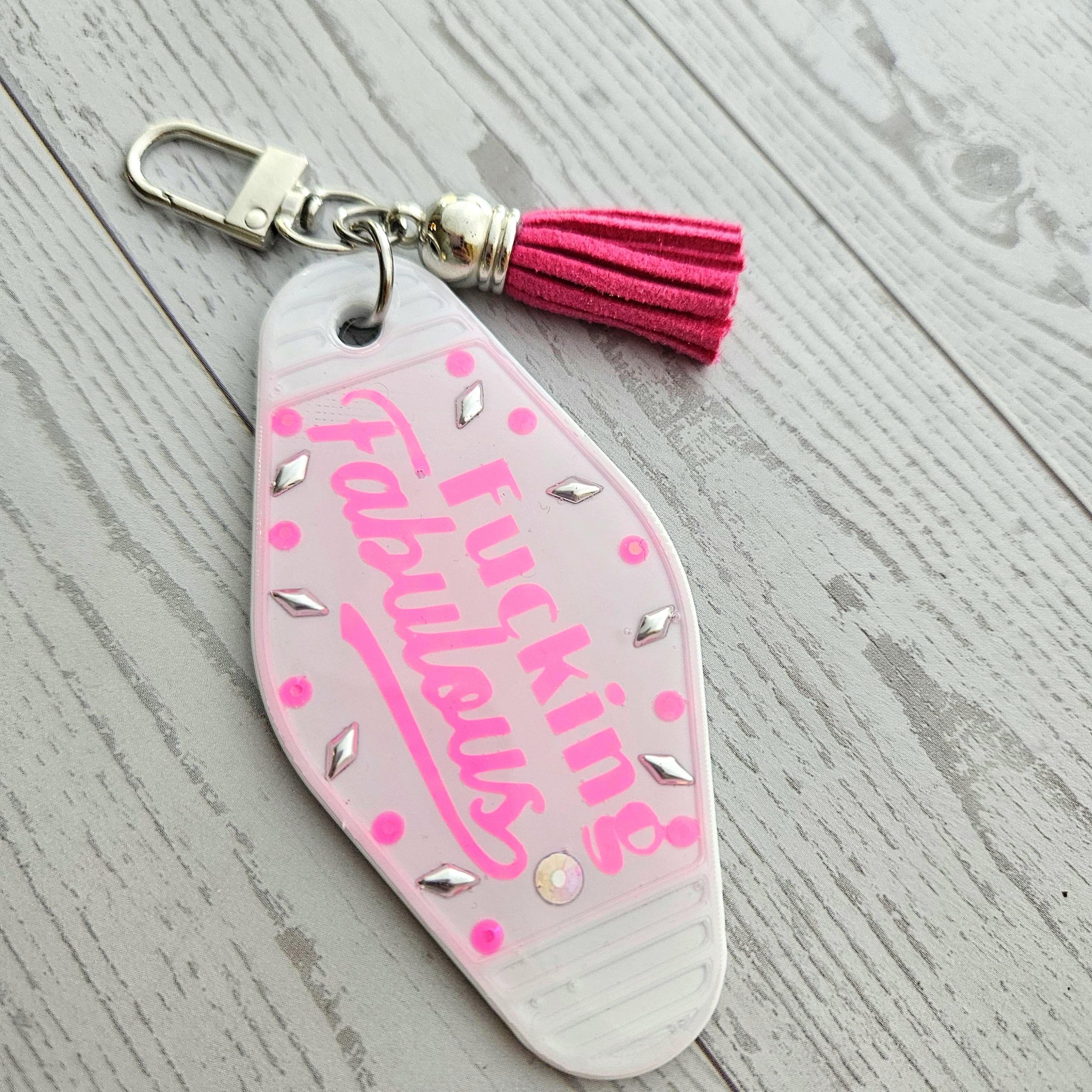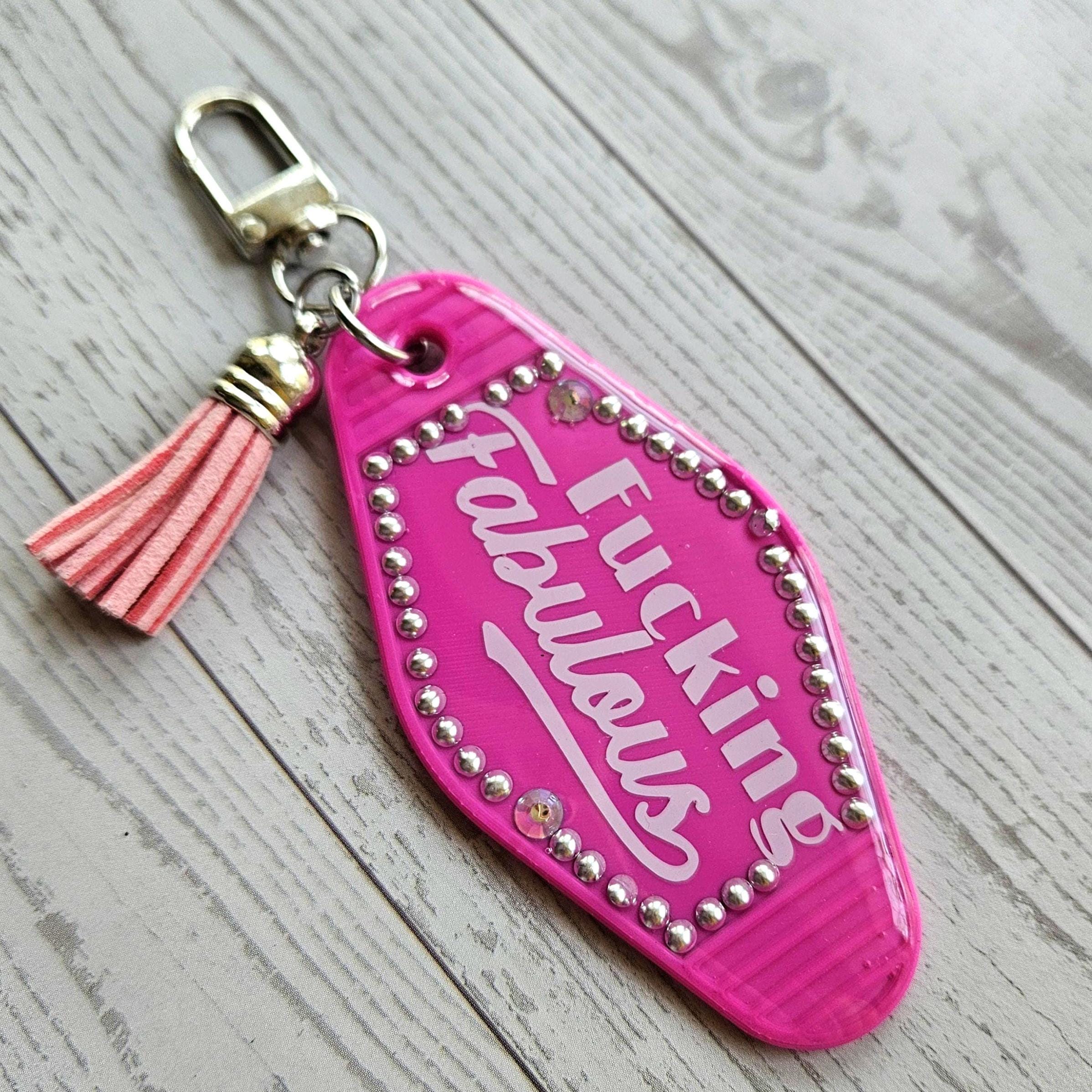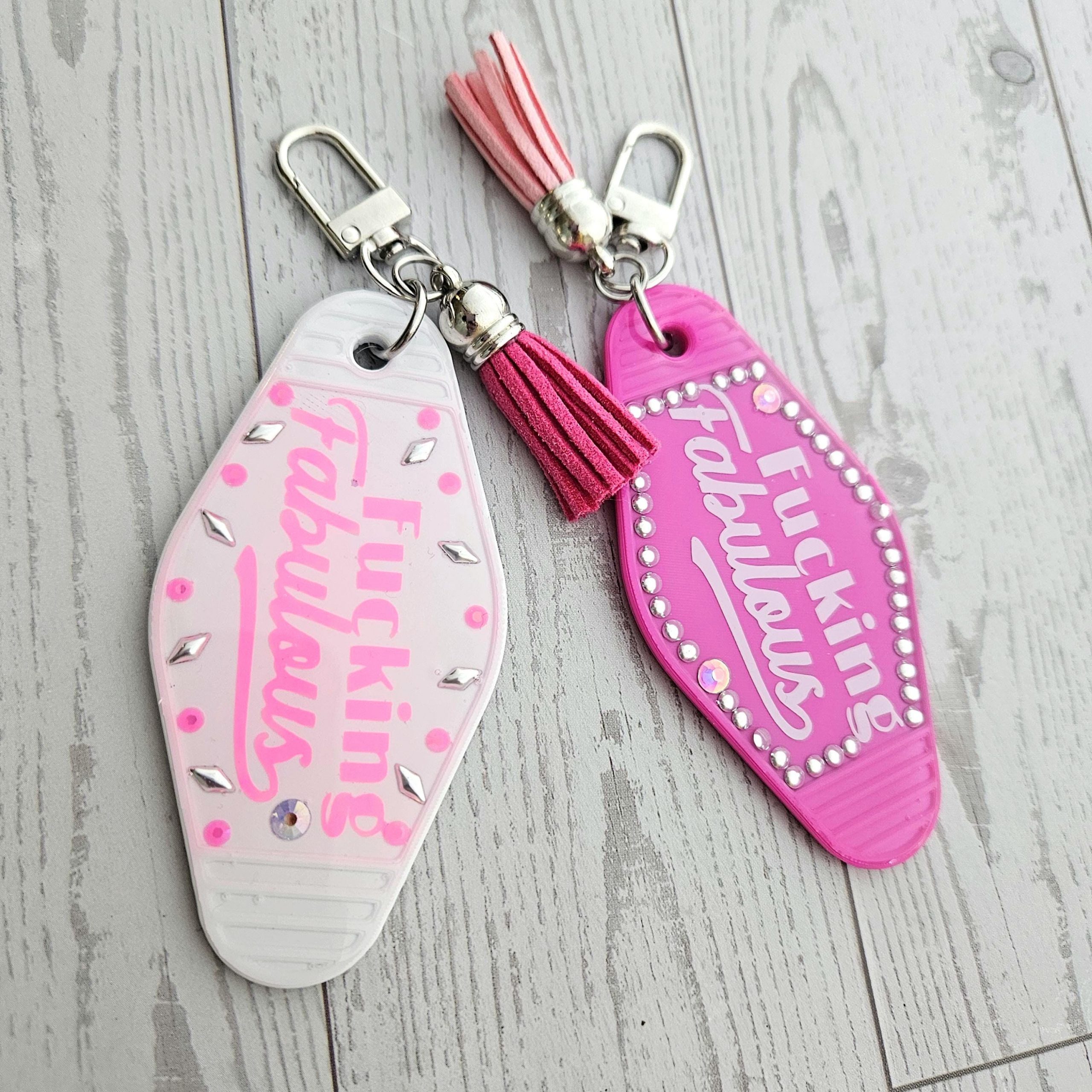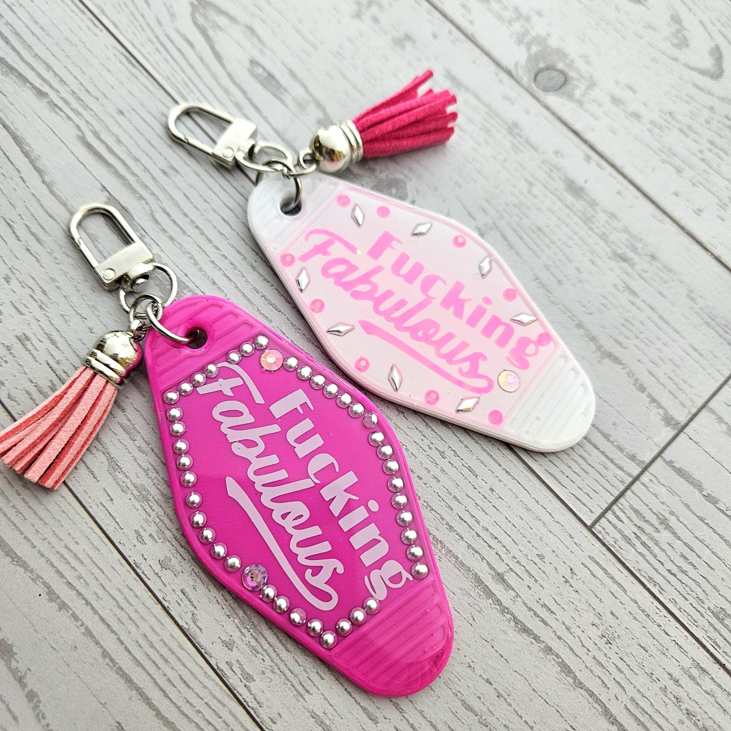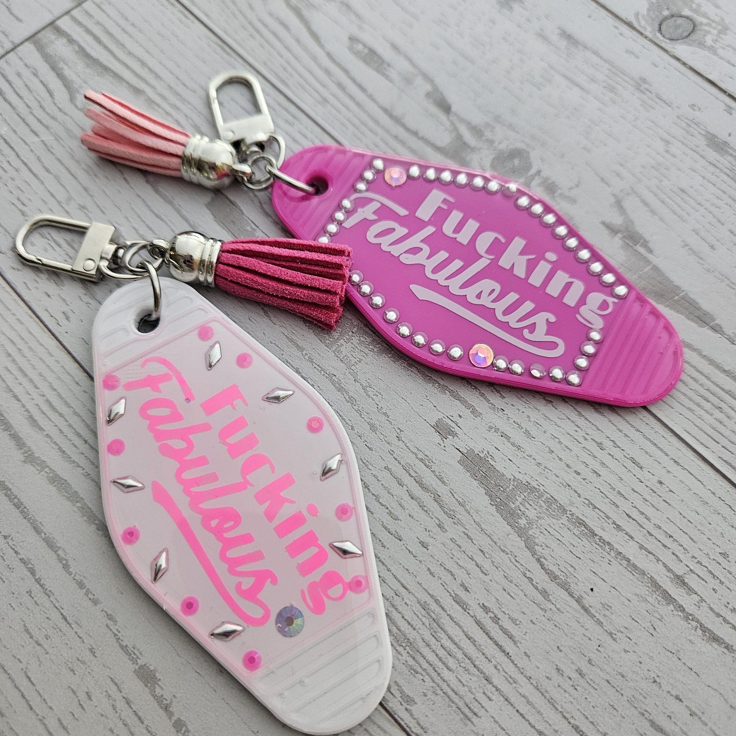 Your keys have been waiting for this energy. Fucking Fabulous handmade rhinestone resin motel keychain in hot pink or blush — bold glam statement keychain and perfect funny gift for her.✨