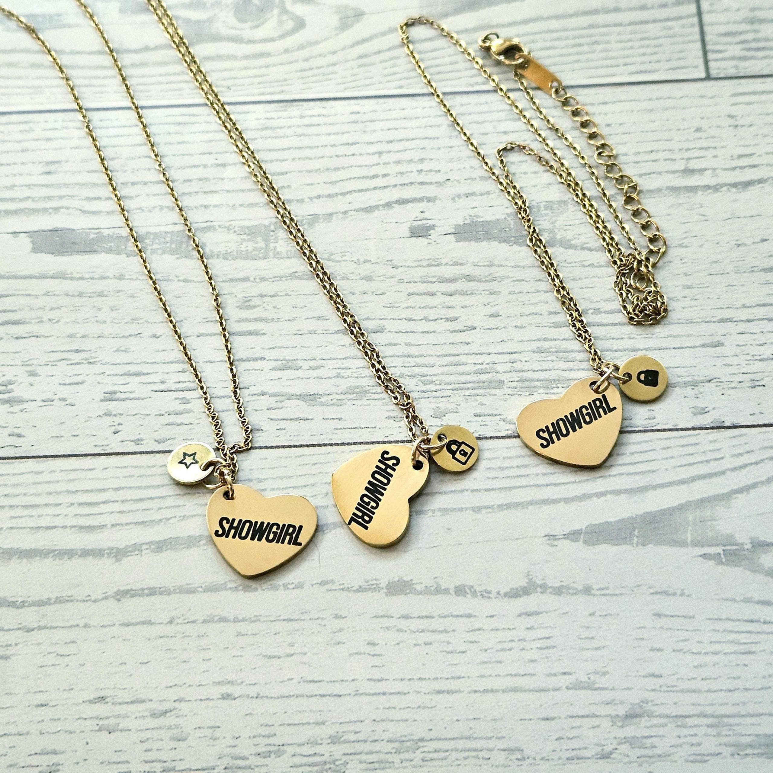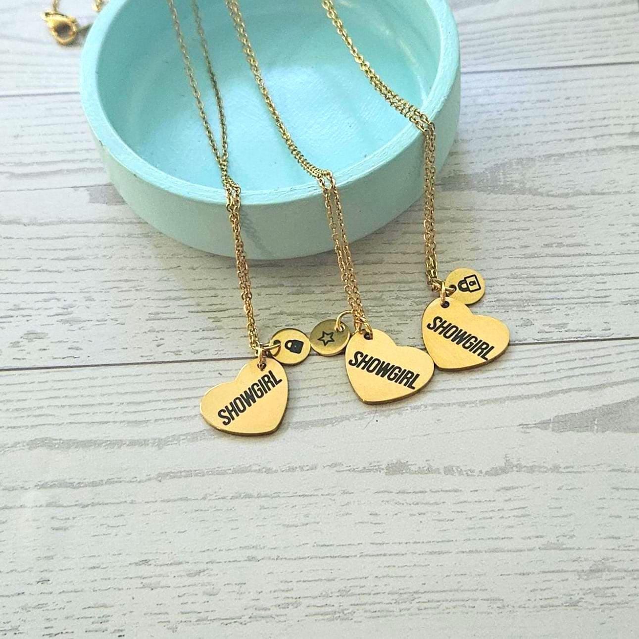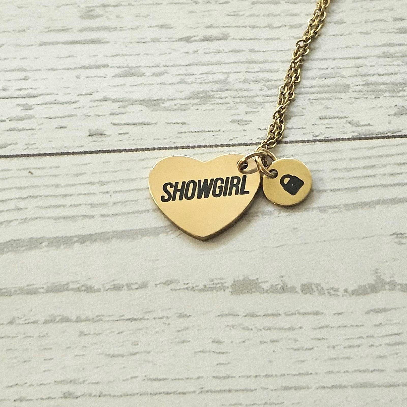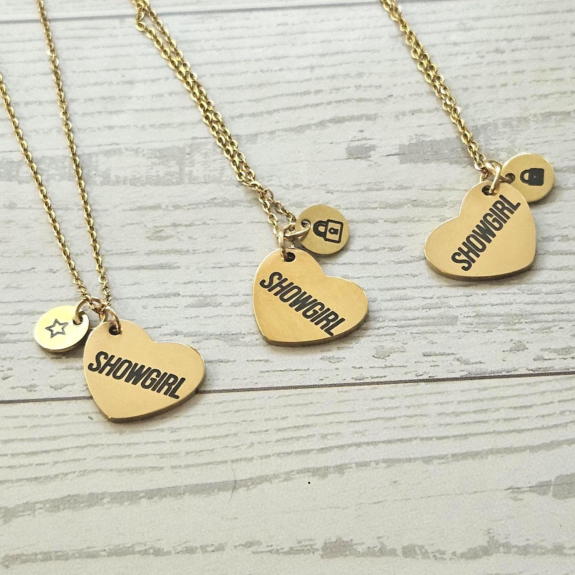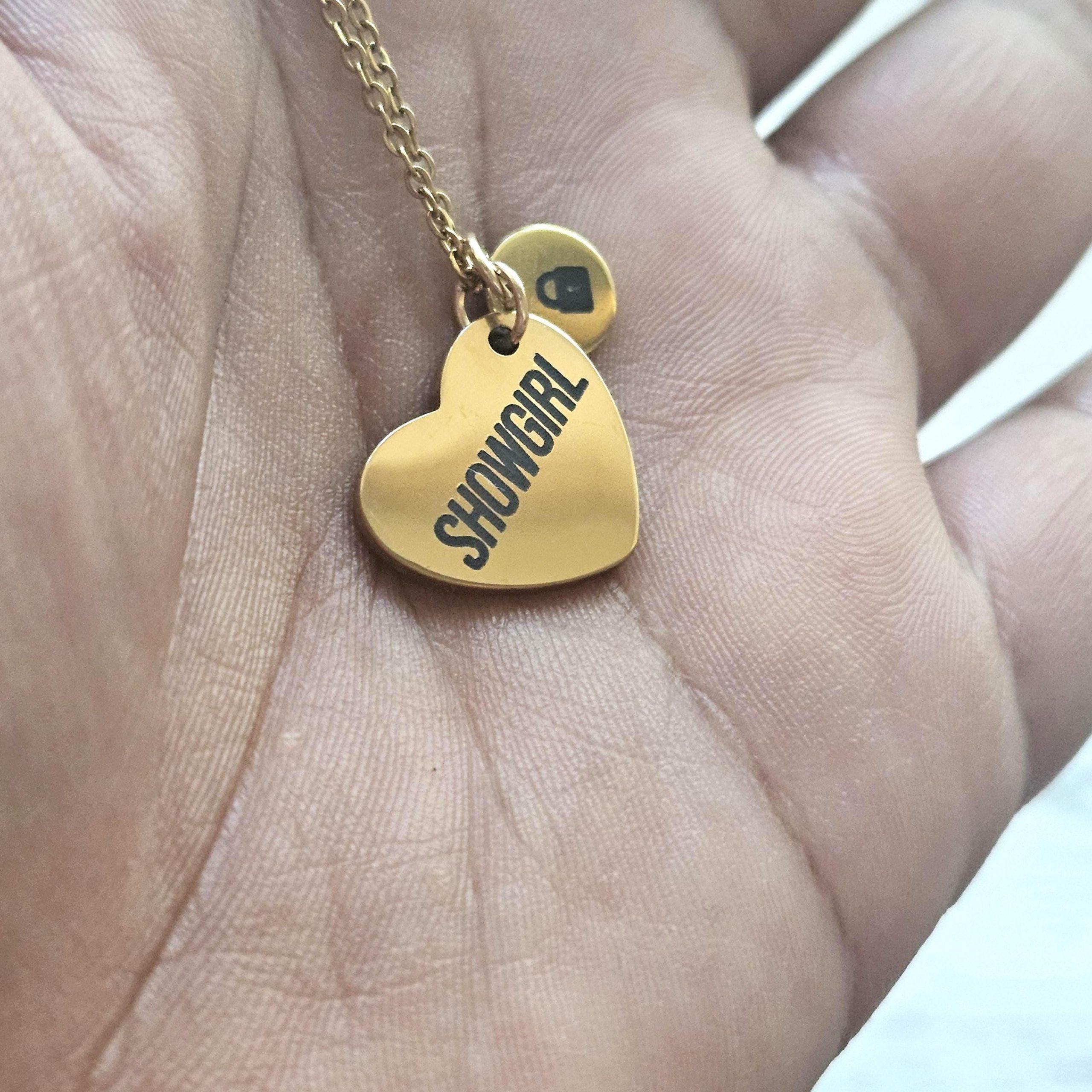 Gold Showgirl Heart Necklace: Engraved Stainless Steel Pendant, Charm Accent – Jewelry – Handmade by ShesSoCrafty Goods