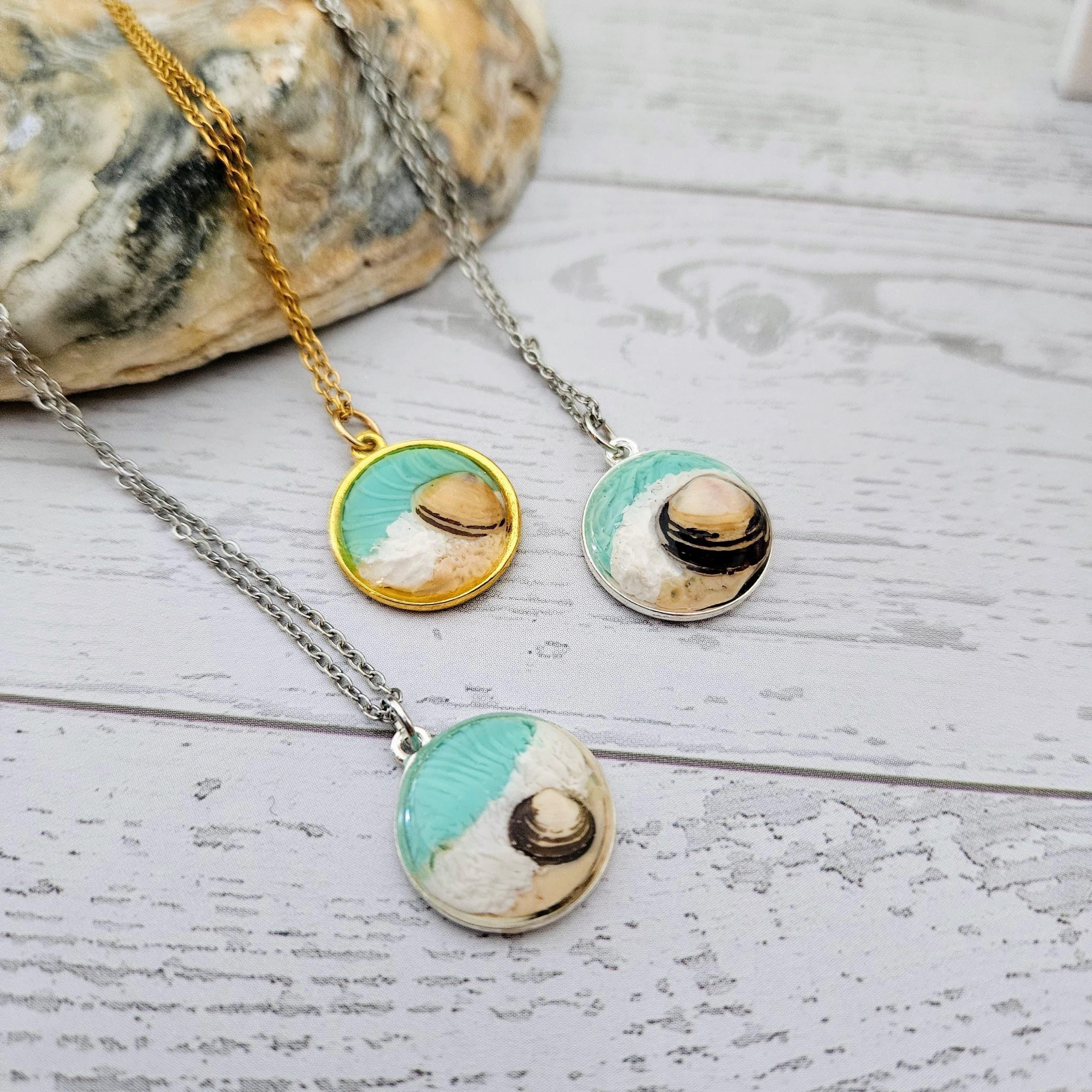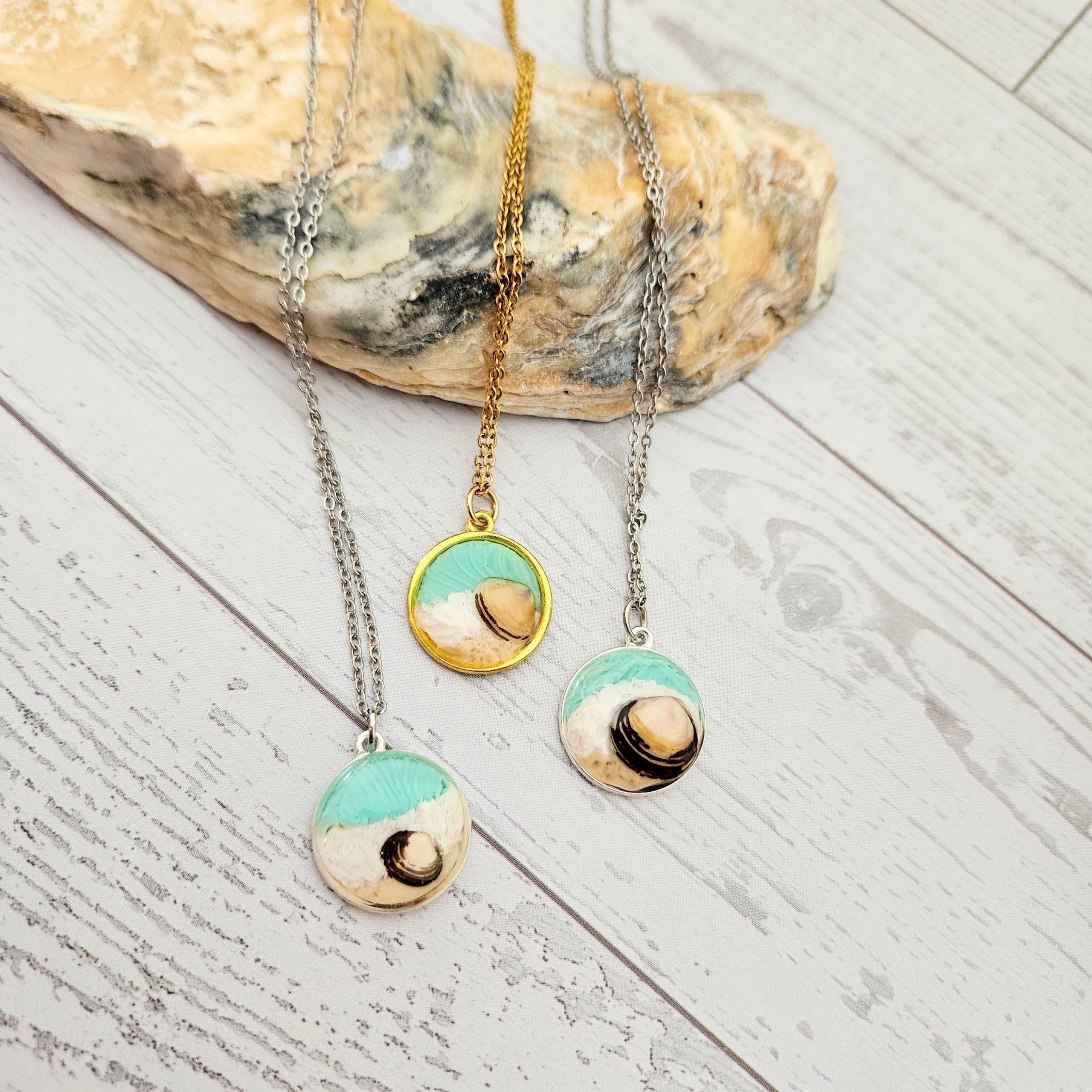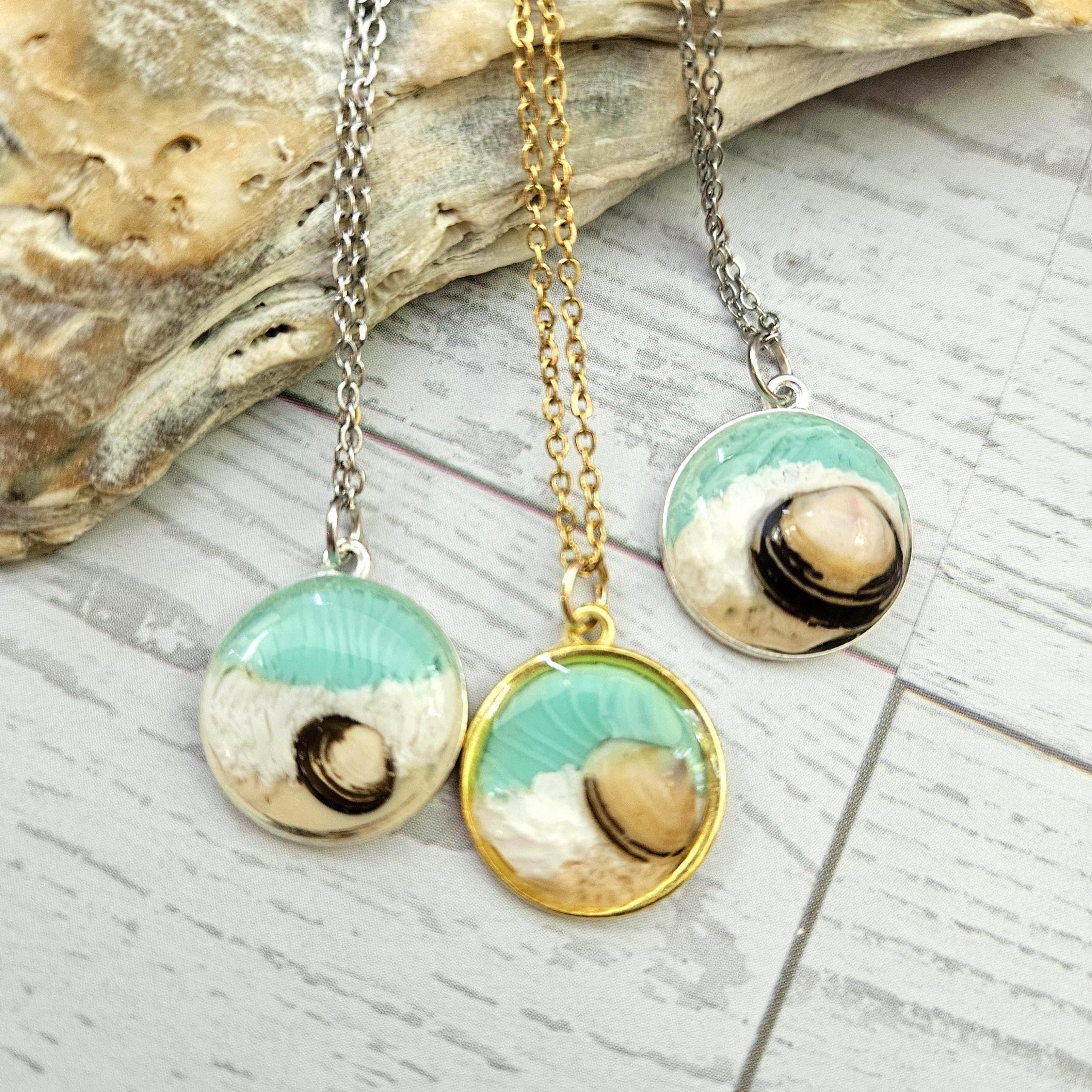 Handmade resin shell pendant with real Maryland-collected shells. Each piece unique. Coastal jewelry for ocean lovers — tarnish-proof stainless chain. 🌊 Ocean-Inspired Elegance