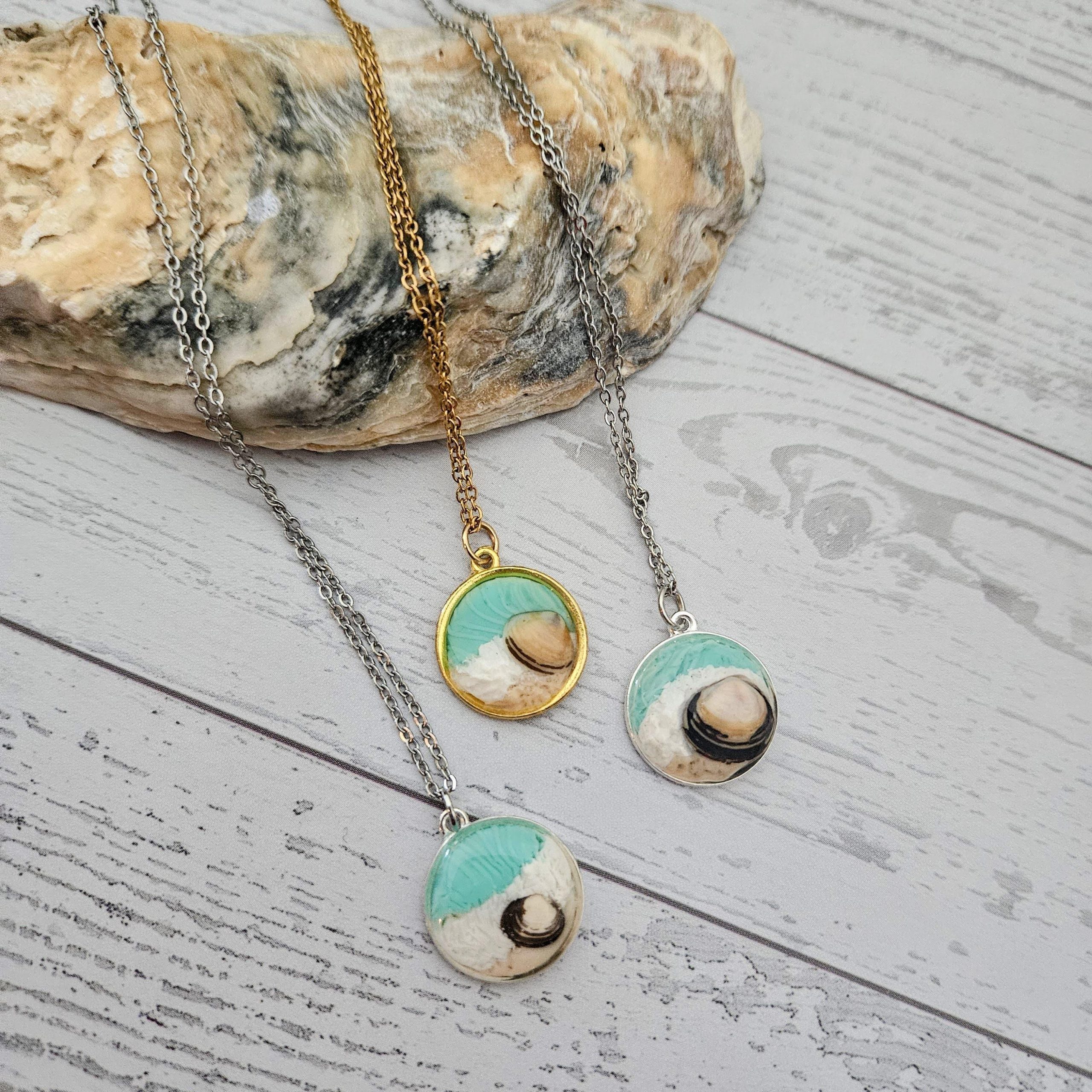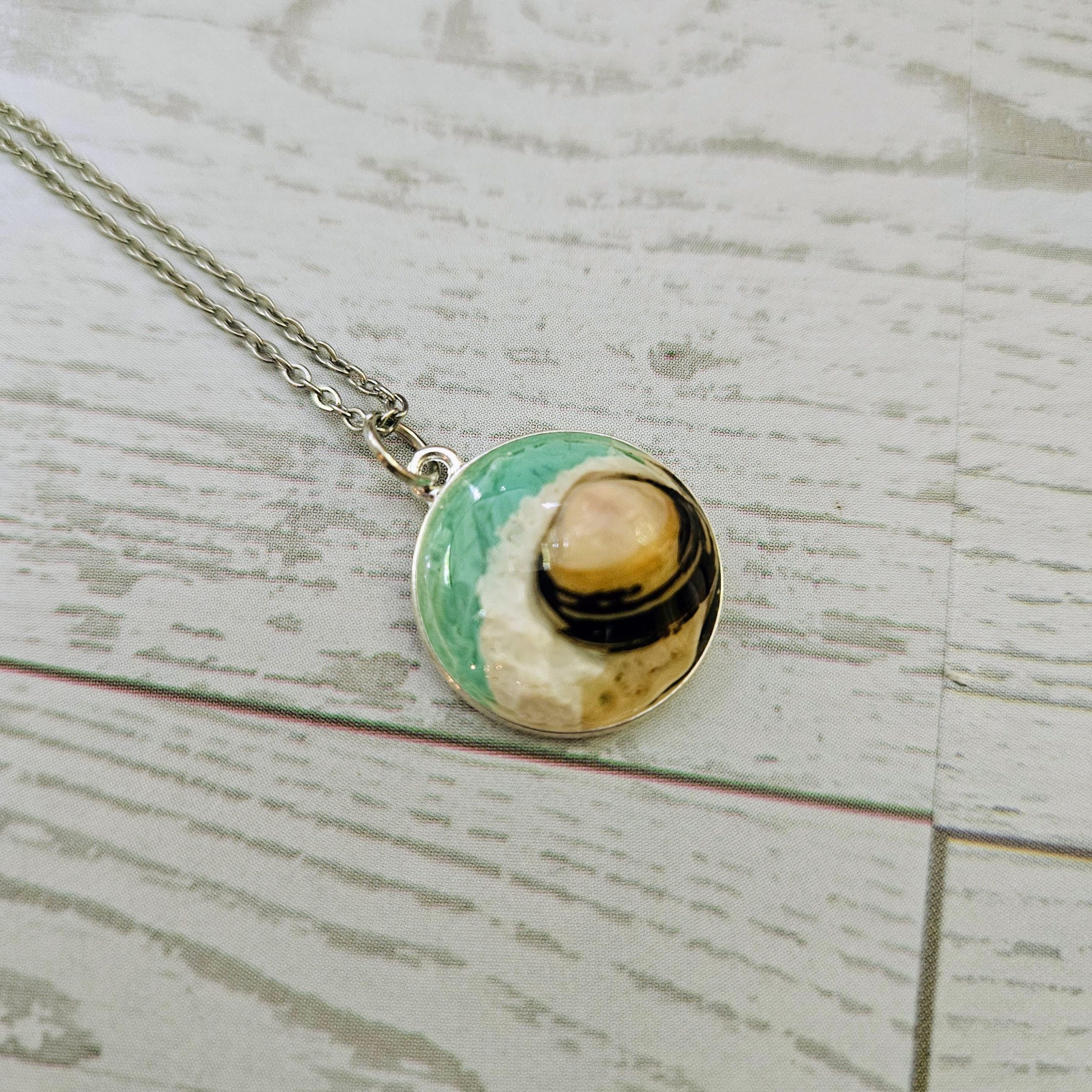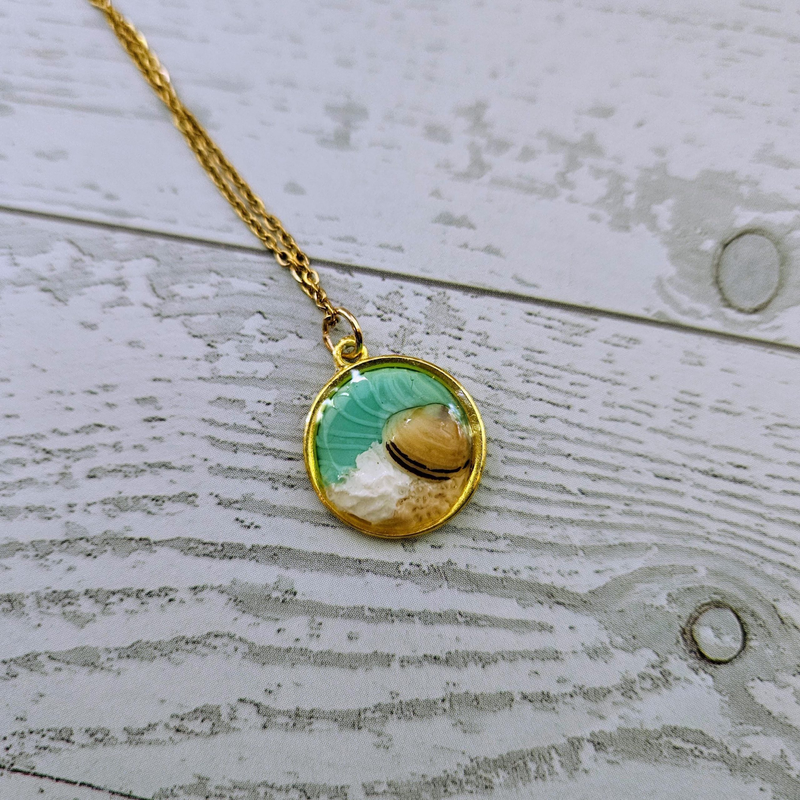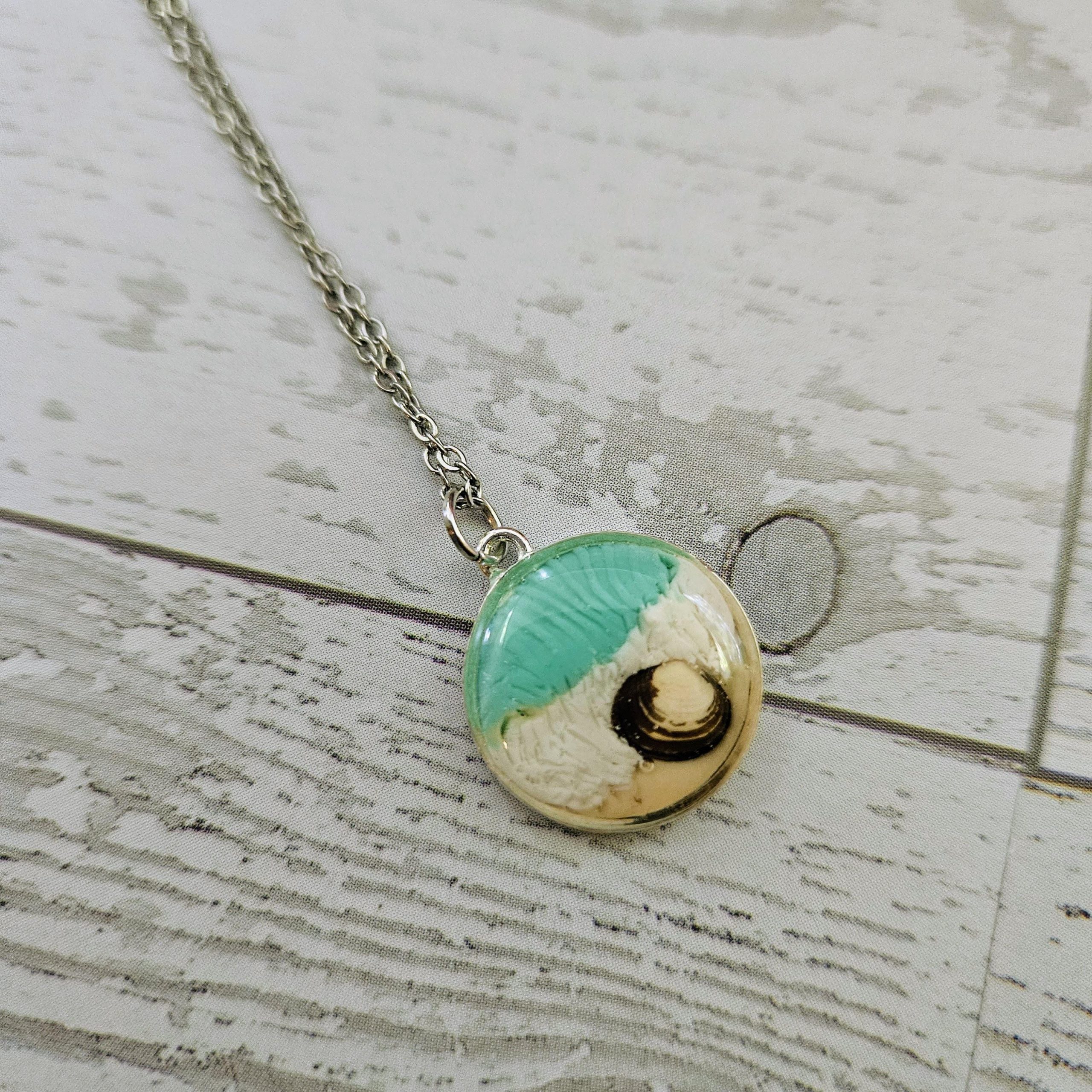 Handmade resin shell pendant with real Maryland-collected shells. Each piece unique. Coastal jewelry for ocean lovers — tarnish-proof stainless chain. 🌊 Ocean-Inspired Elegance