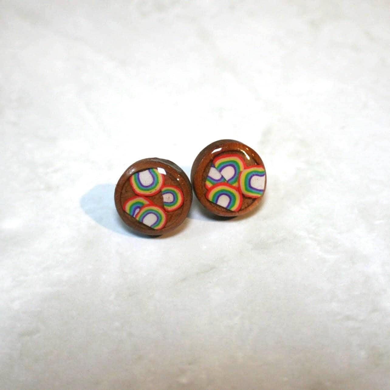 Handmade Wood & Resin Rainbow Stud Earrings – 12mm Round Stainless Steel Studs – LGBTQ+ Pride Jewelry – Jewelry – Handmade by ShesSoCrafty Goods