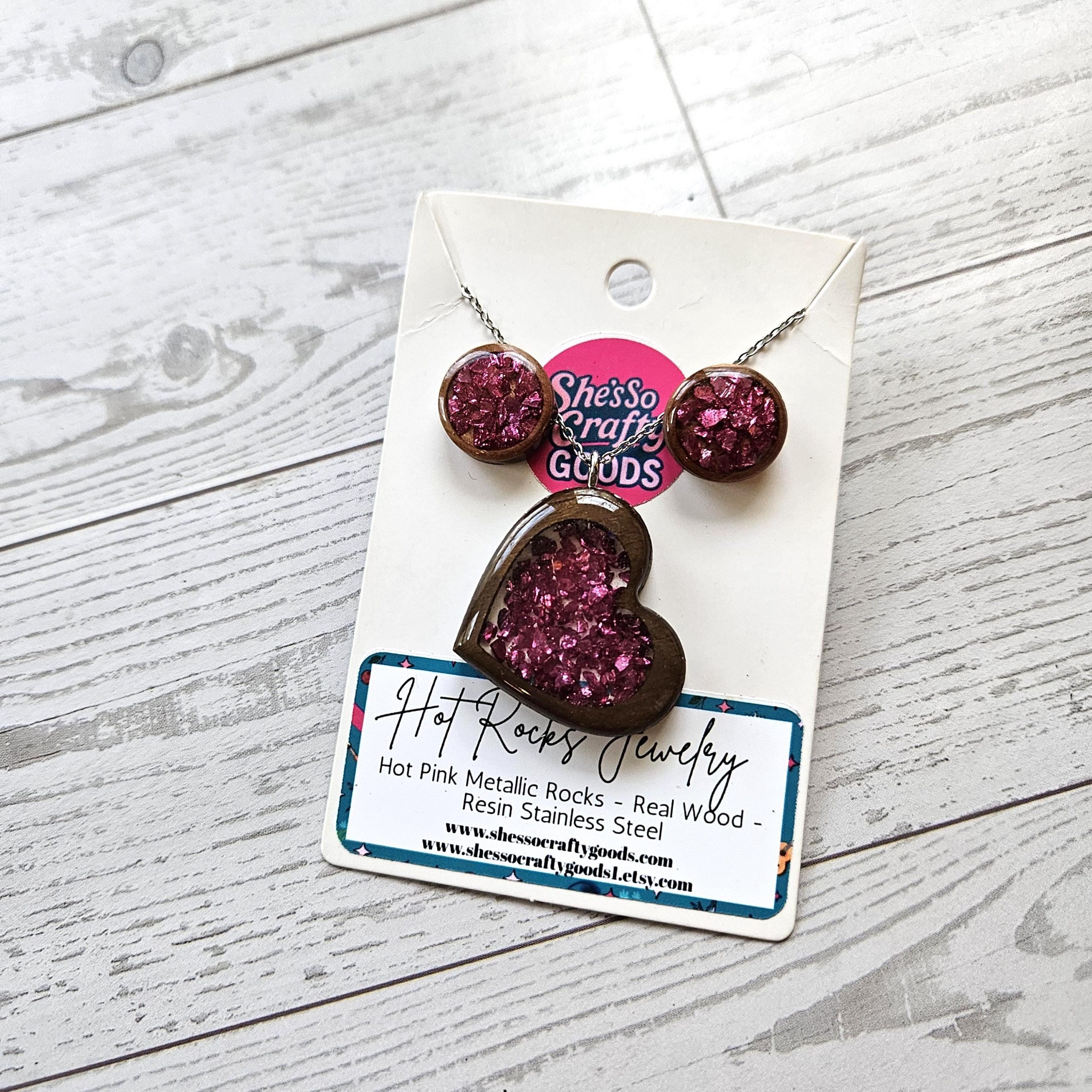 The Hot Rocks Jewelry Set is handcrafted in our College Park, MD studio using real walnut wood and hot pink metallic rock resin — sealed in a high-gloss finish that catches light like it has something to prove.