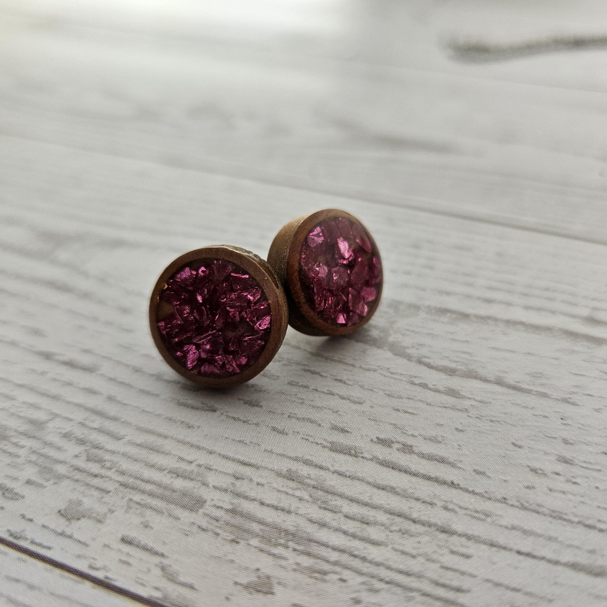 💗 Two matching round wood resin stud earrings on stainless steel posts