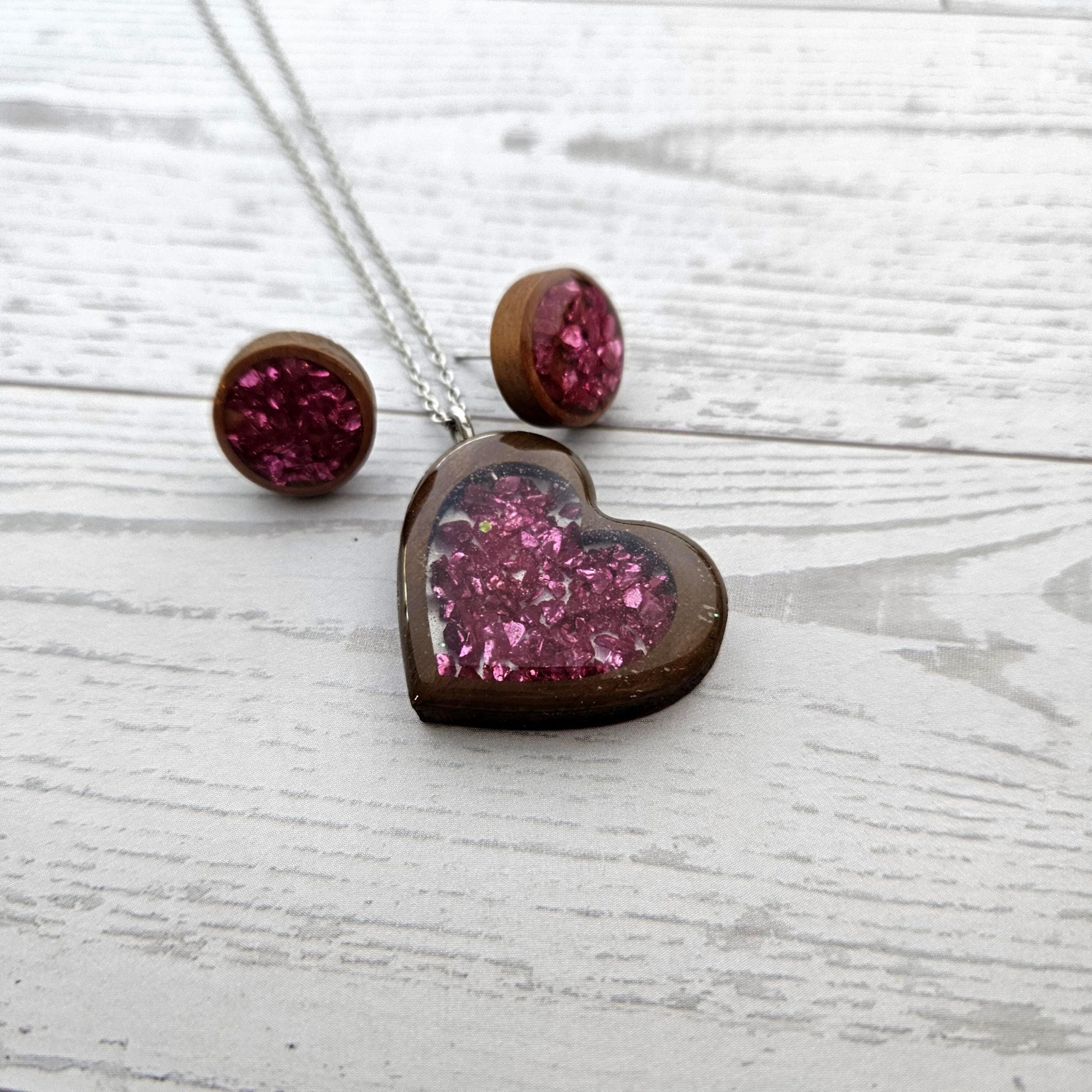Hot Pink Wood Resin Heart Necklace and Earring Set | Handmade Jewelry
