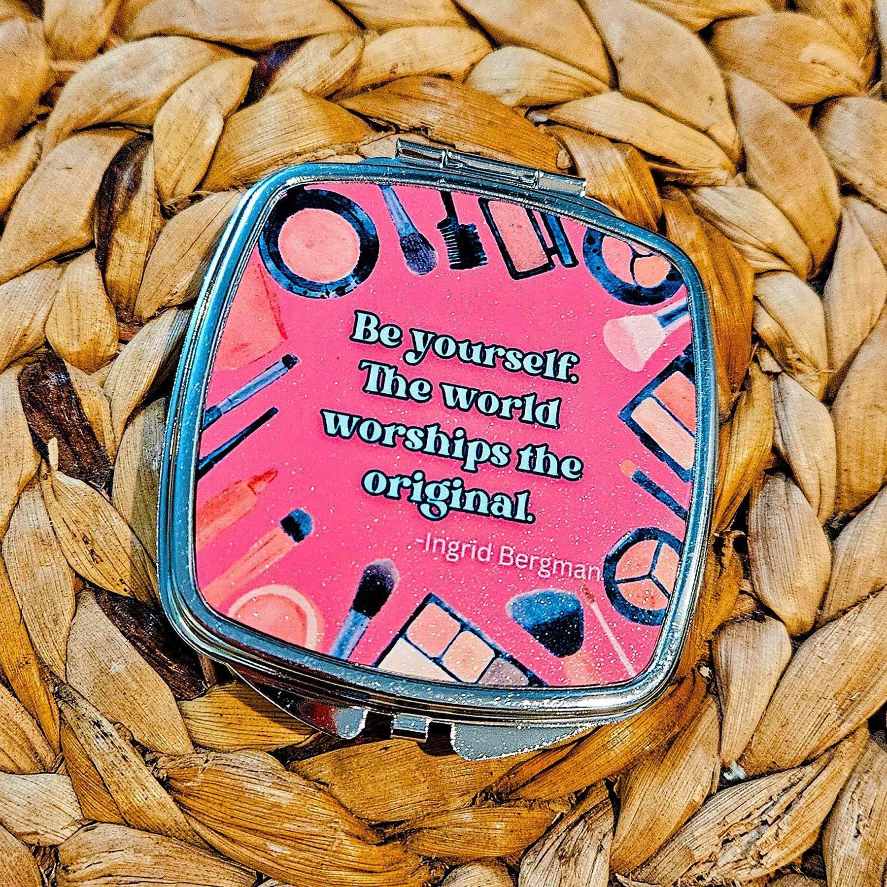 Add a touch of classic sophistication to your beauty routine with this chic compact mirror, featuring the iconic quote by Ingrid Bergman: "Be yourself. The world worships the original." This handbag mirror is the perfect accessory for anyone who appreciates vintage glamour and a powerful reminder to stay true to yourself.