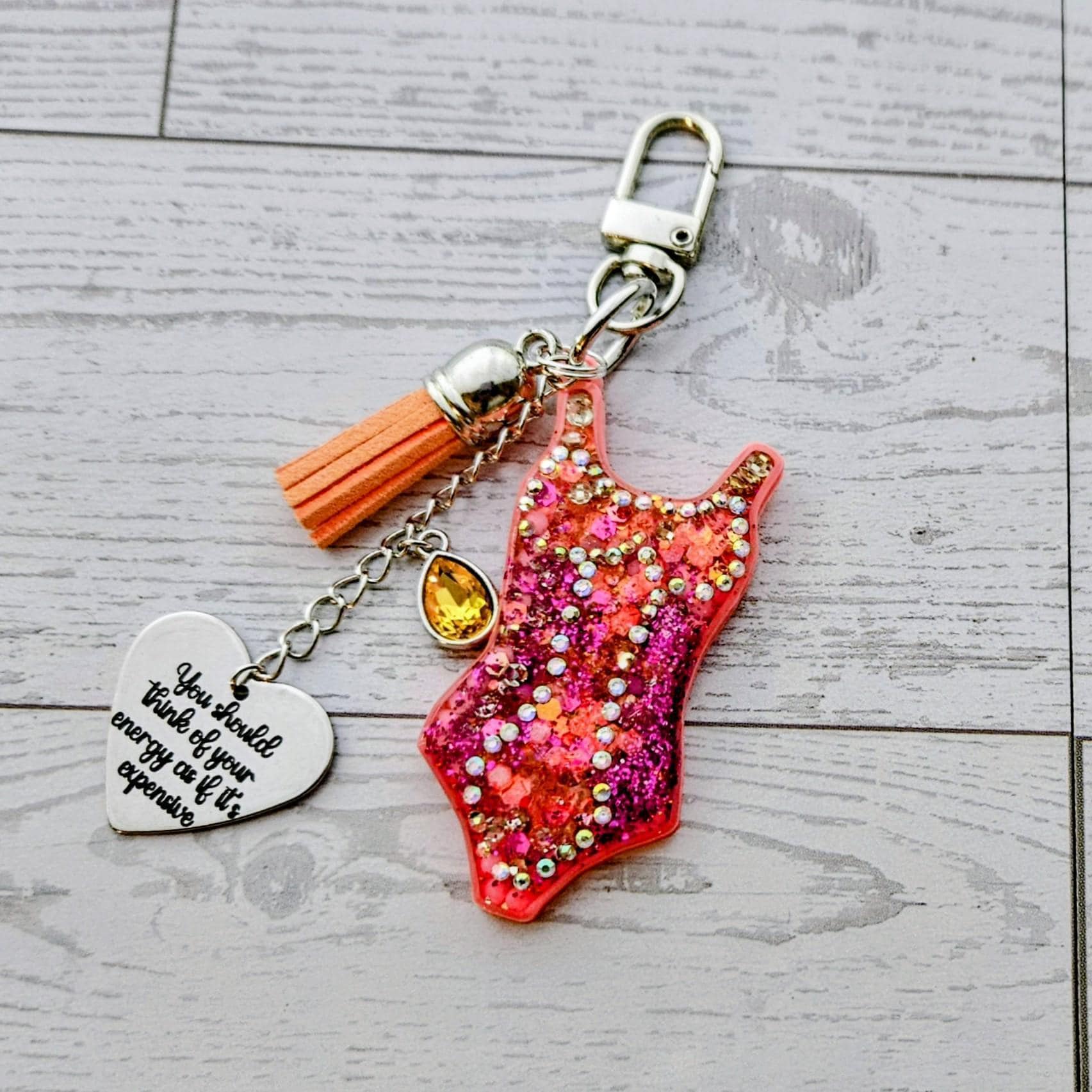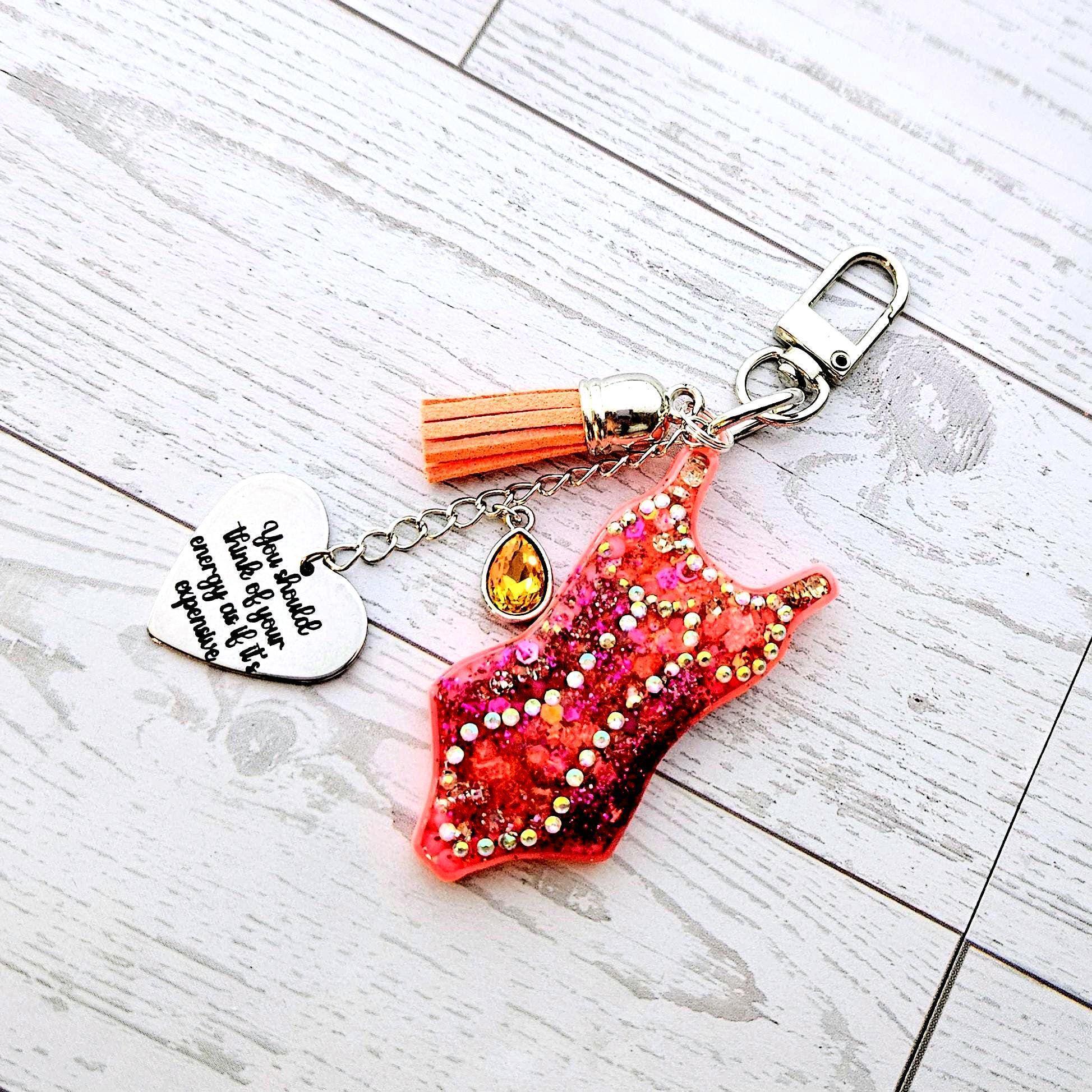 Not a mass-market mold! This ~2.5" tall piece starts as a custom 3D-printed body, hand-set with rhinestones and vivid orange glitter, then sealed in high-gloss resin for ultimate durability. It clips securely to your tote or keys with a pristine stainless steel U-shaped lobster clasp, finished with a matching tassel and gem.