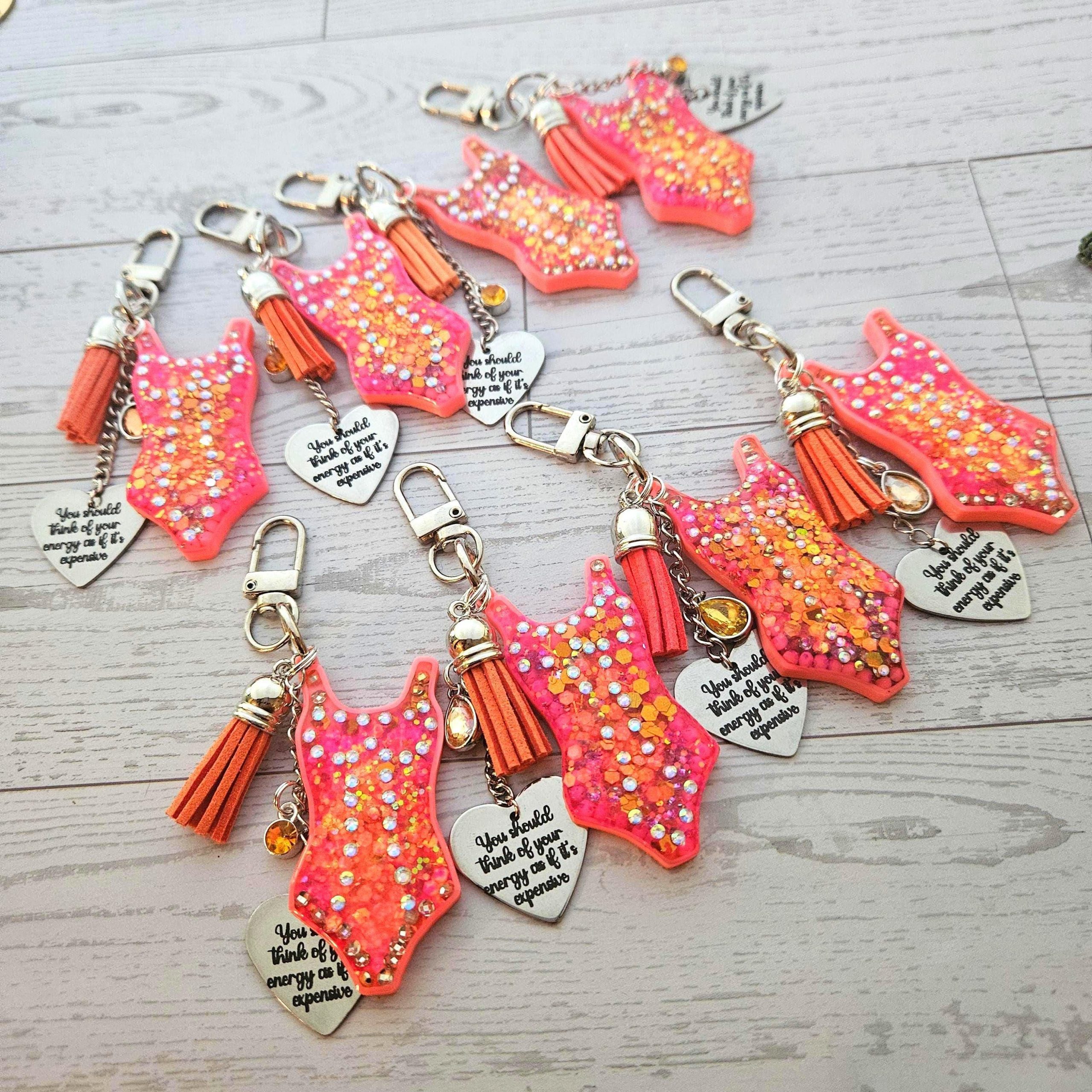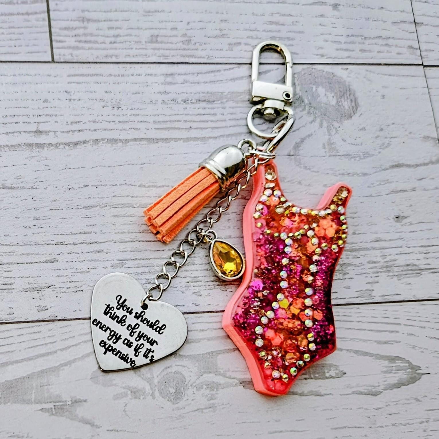 Orange Showgirl Era Bodysuit Keychain – Rhinestone Resin Bag Charm with Engraved Quote