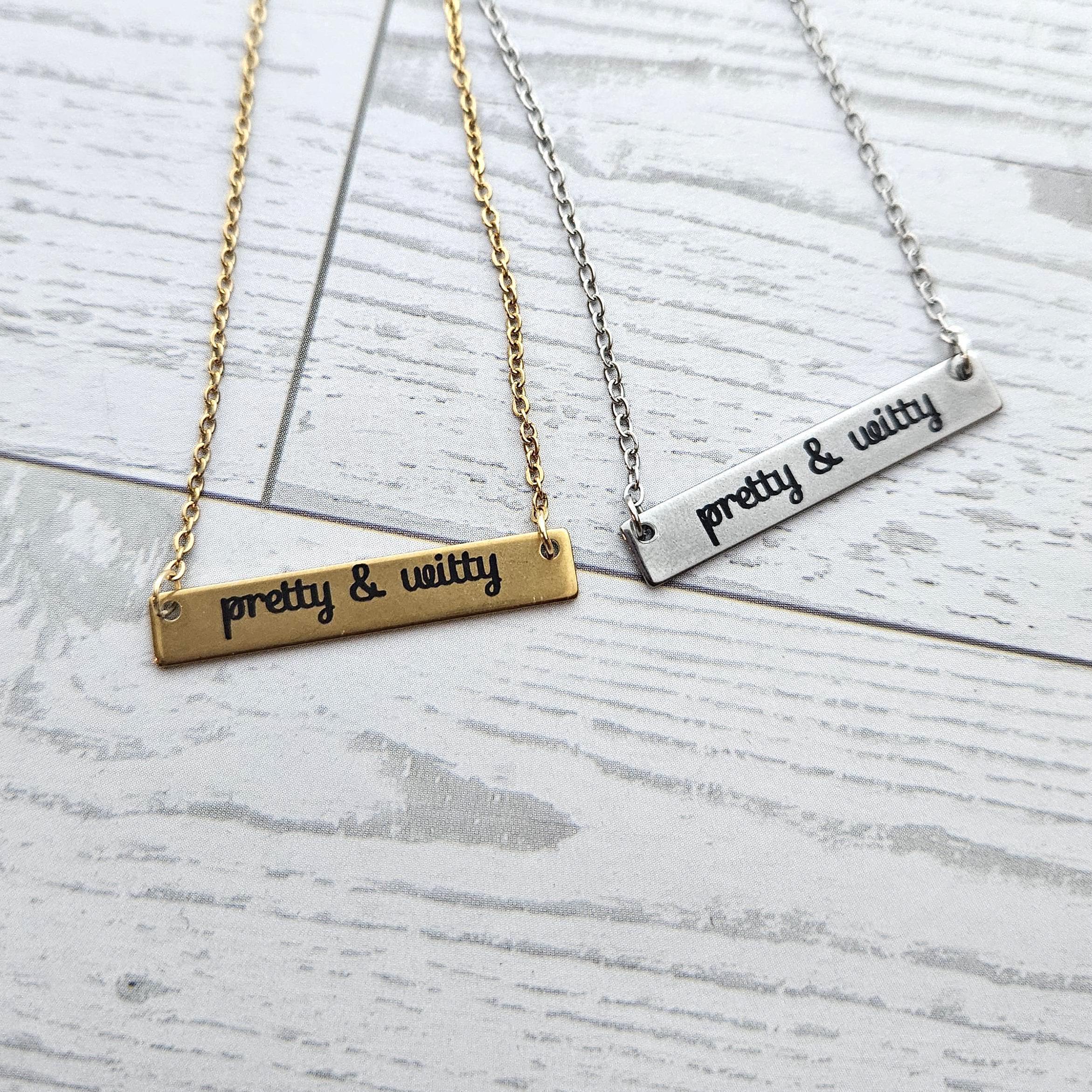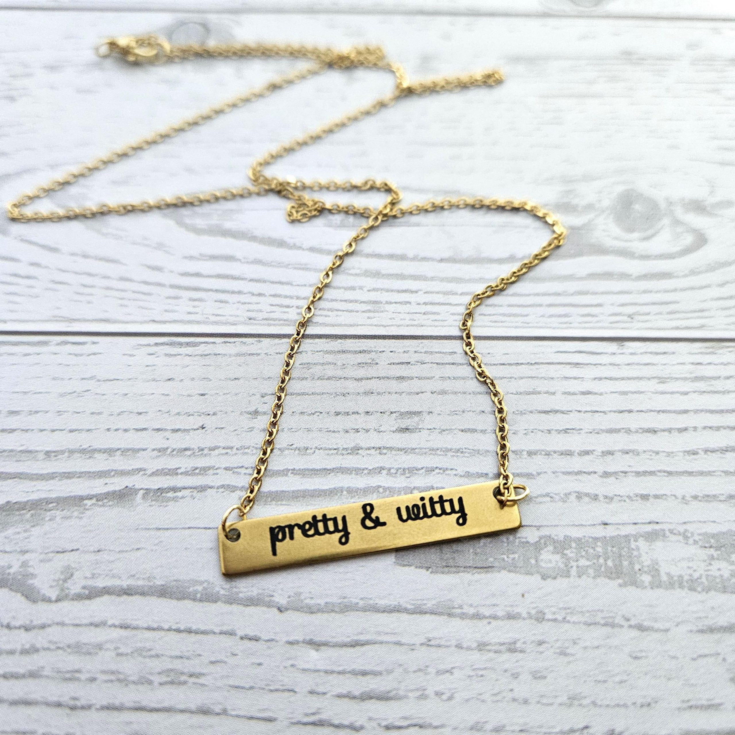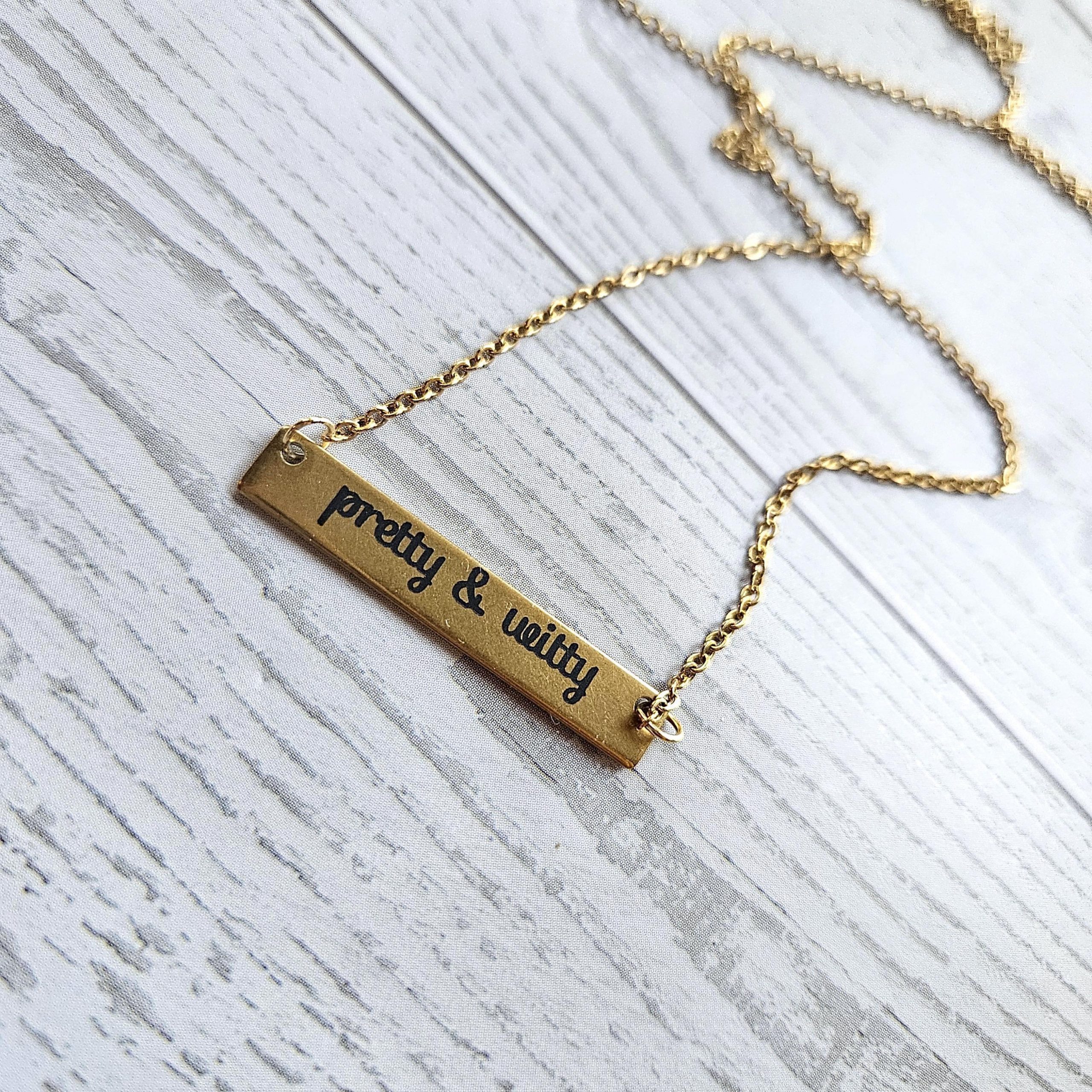 Pretty & Witty Necklace • 18K Gold PVD or Satin Stainless Steel • Tarnish-Proof Bar Jewelry – Jewelry – Handmade by ShesSoCrafty Goods