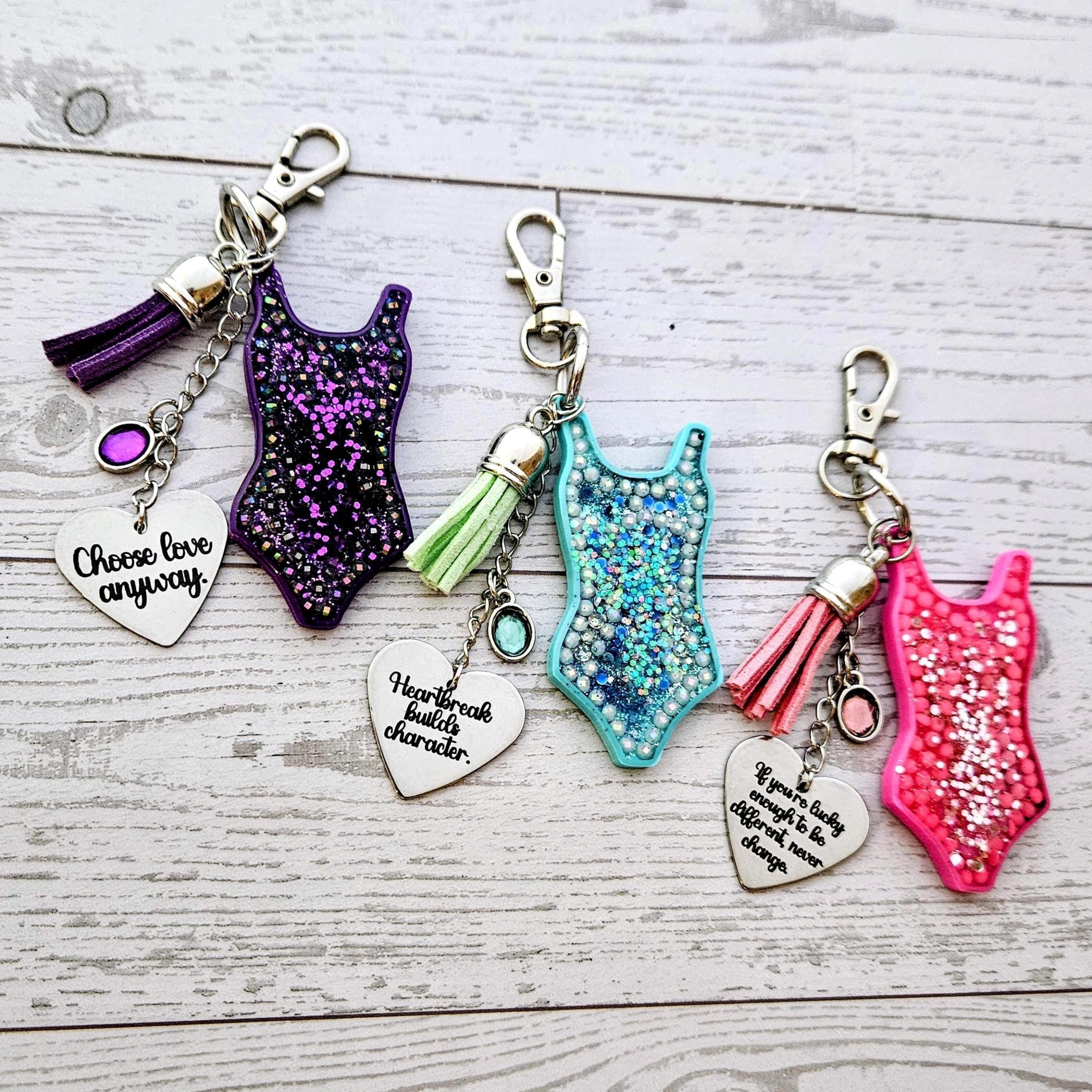 Glitter rhinestone showgirl bodysuit bag charm in pink, blue, or purple. Personalized engraving up to 54 chars. Handmade resin keychain, ships 1-3 business days⨠Sparkle Meets Showgirl Energy. Clip some glam wherever you go! This handmade Showgirl Eras Bodysuit Bag Charm & Keychain is inspired by iconic stage looks and designed for anyone who loves glitter, sparkle, and a touch of sass.