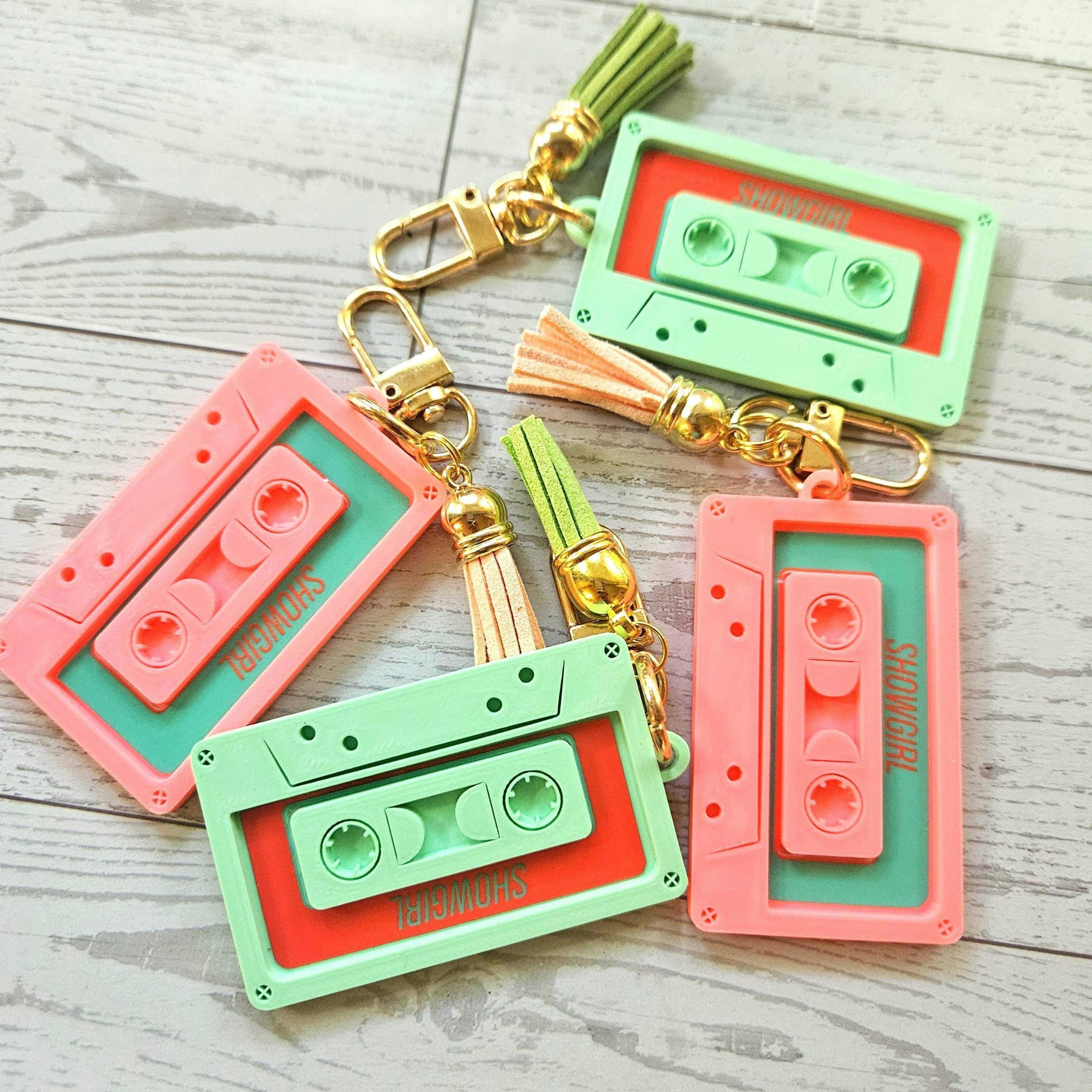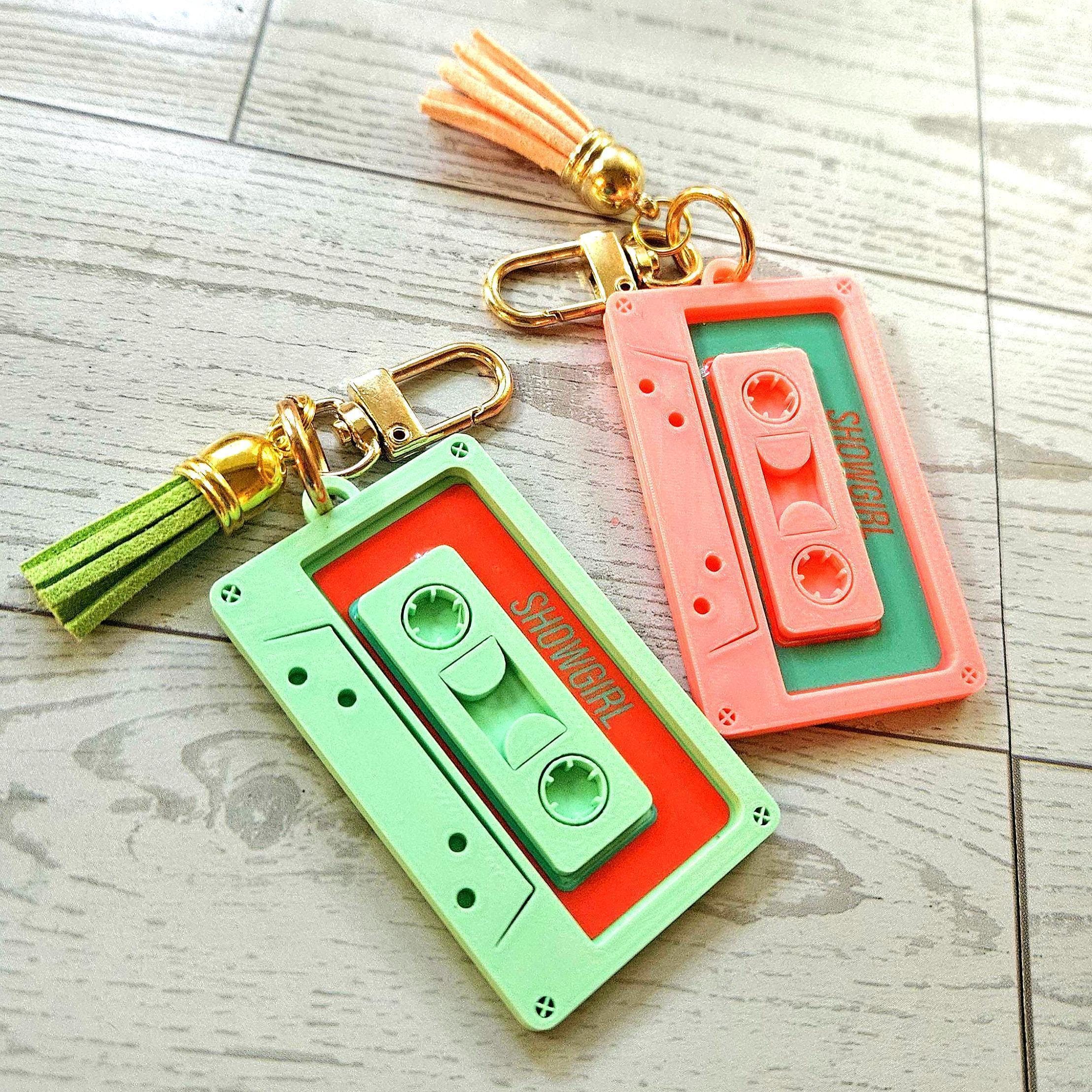 ✨ Your New Favorite Throwback Accessory is our retro Showgirl cassette tape keychain. Add a pop of retro fun to your everyday carry! These cassette tape keychains are handmade, vibrant, and totally unique. Available in mint green or orange, each one features a laminated, customizable label and comes with a tassel accent + gold hardware for a bold finish.