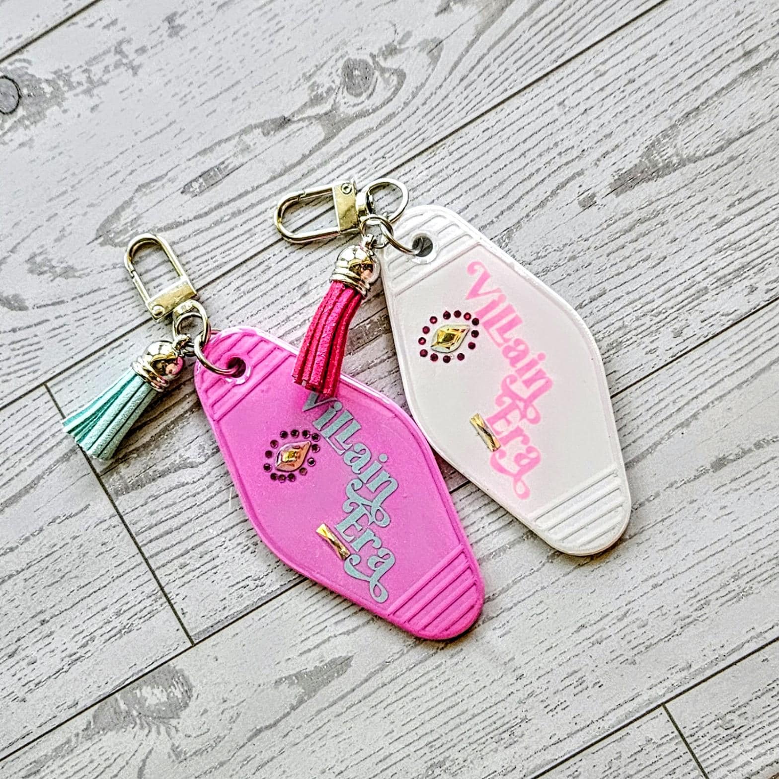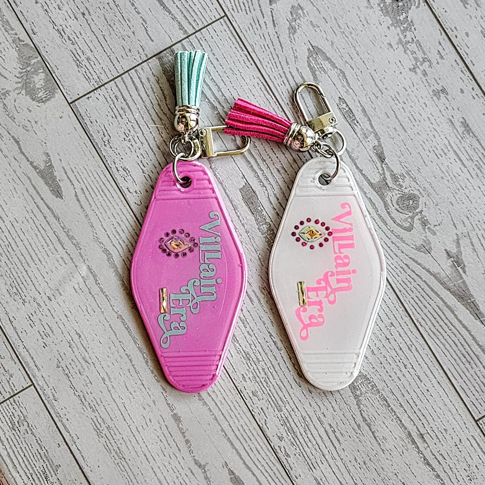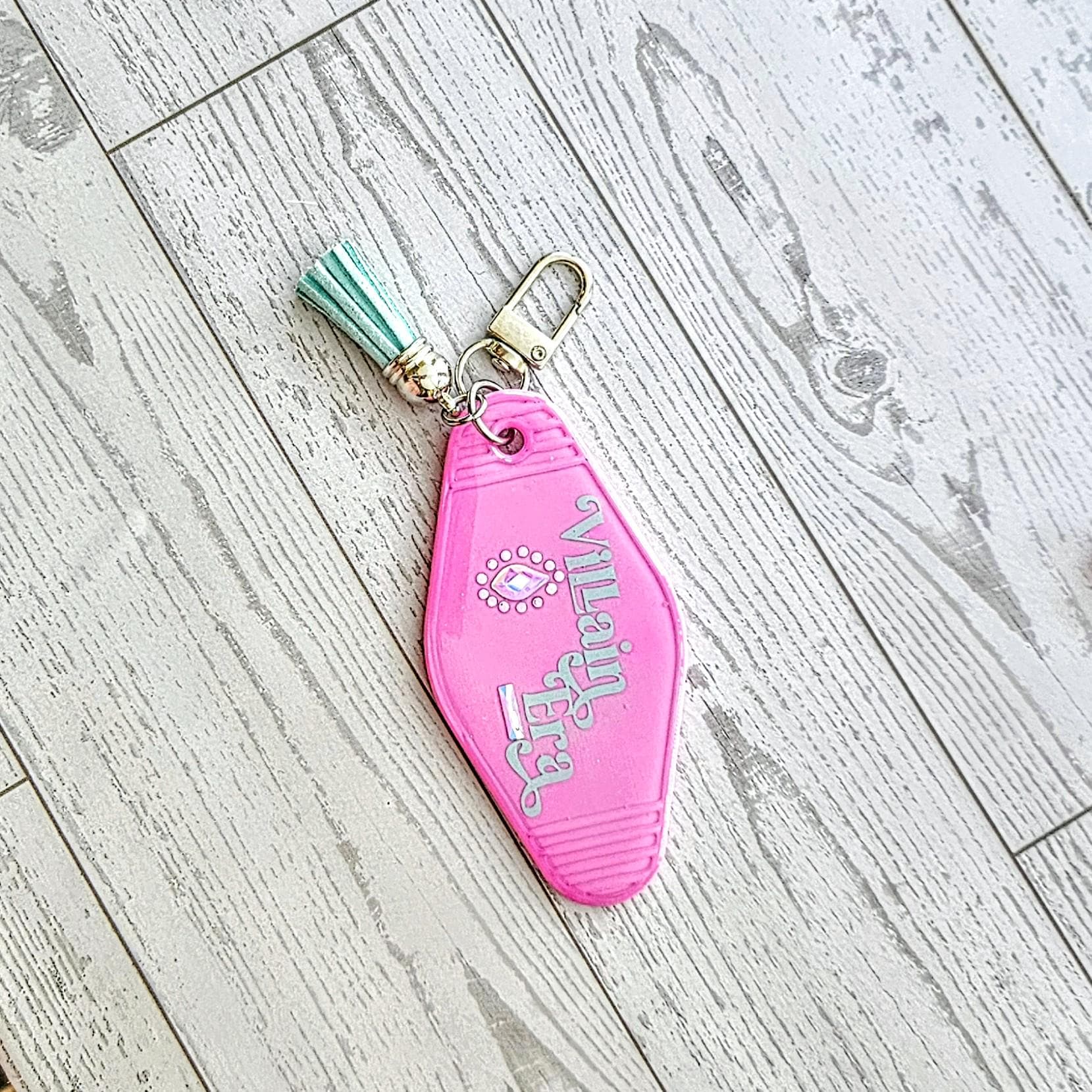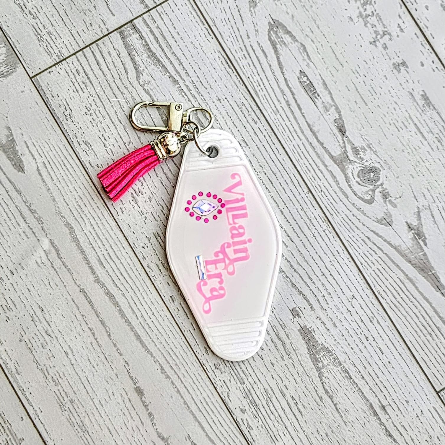 This Villain Era motel keychain features a rhinestone evil eye accent, color-matching tassel, and swirly retro vinyl text β the resin motel key tag that hits different on every key ring.