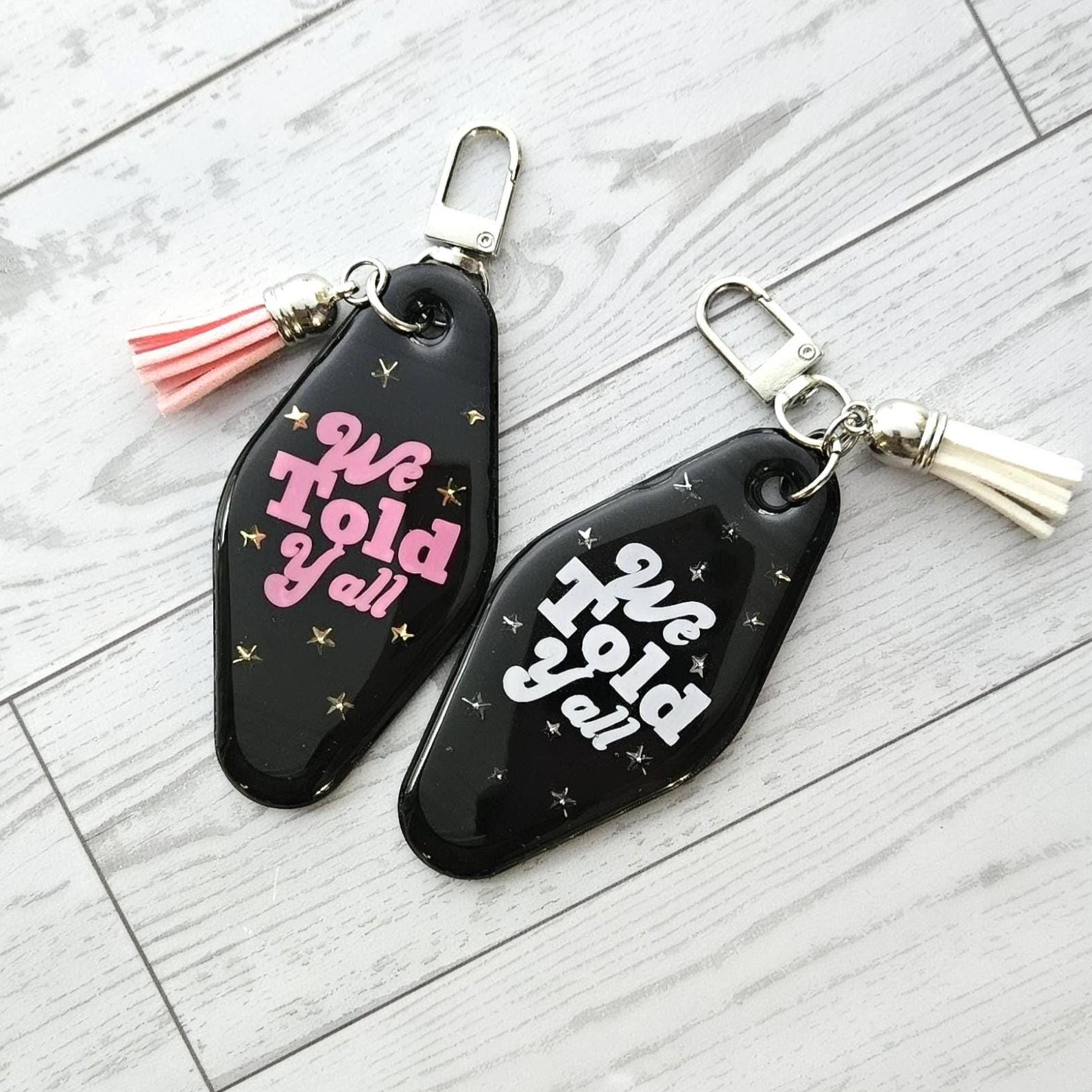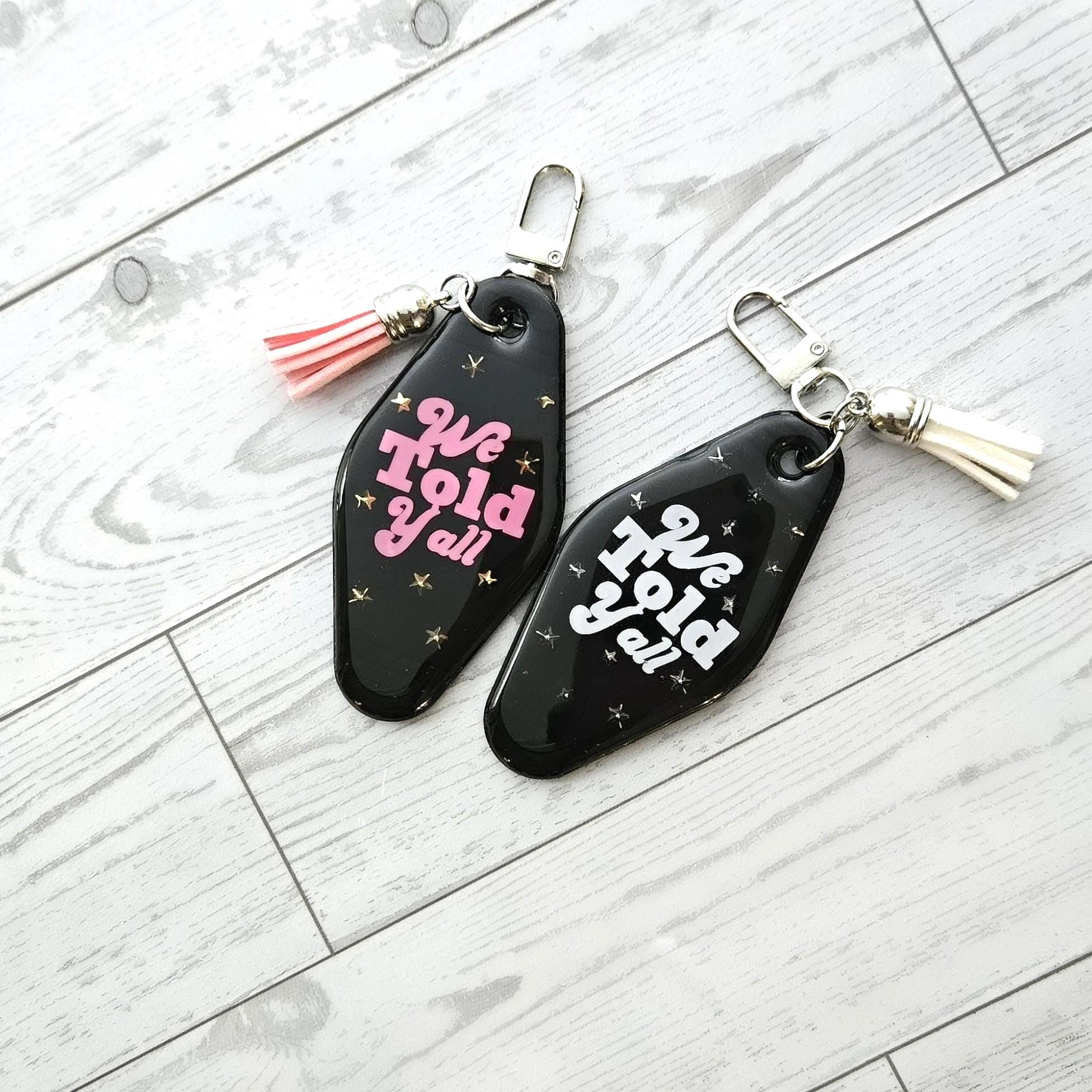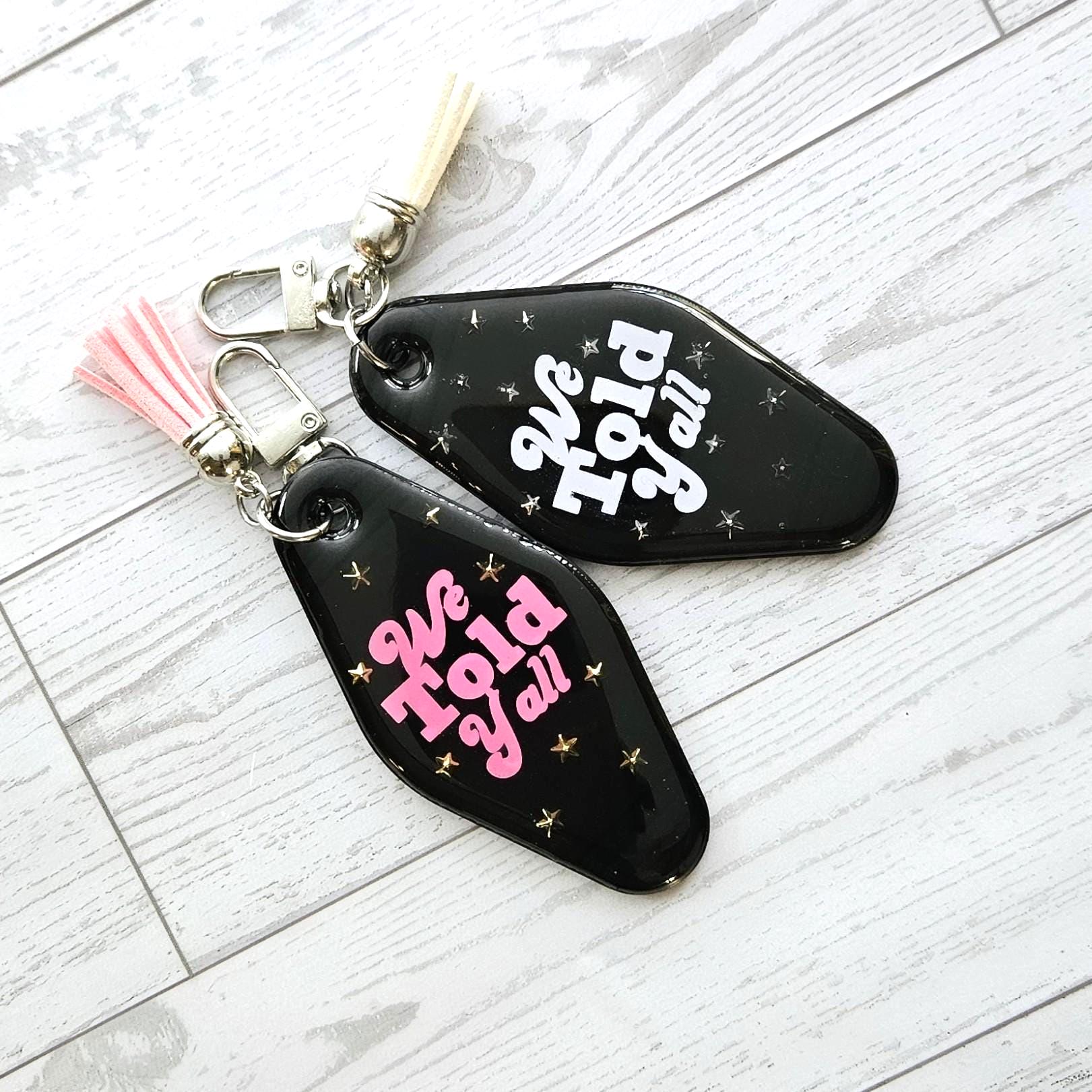 This We Told Y'all motel keychain is handmade resin — gold and silver star embeds sealed into a glossy finish, bold retro script, and a faux leather tassel. Built on an original custom-designed 3D printed base, not a bought blank. The statement is pe Read more
